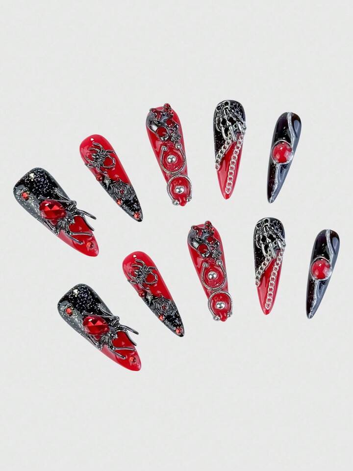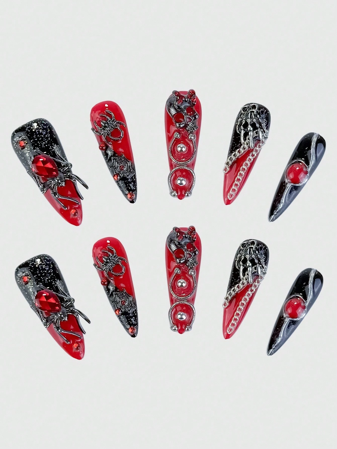 Anime 10 Stück Gothic Dark Punk Spinnennetz Nische Skurrile Skelett Kette Künstliche Fingernägel und 1 Stück Klebeband, Halloween