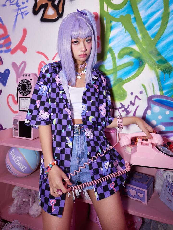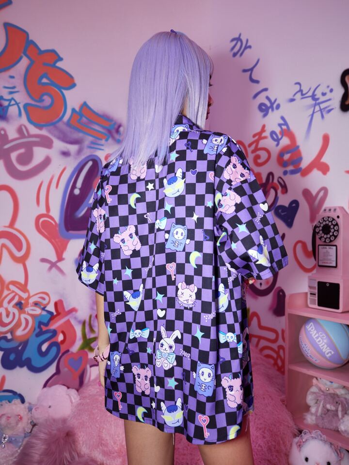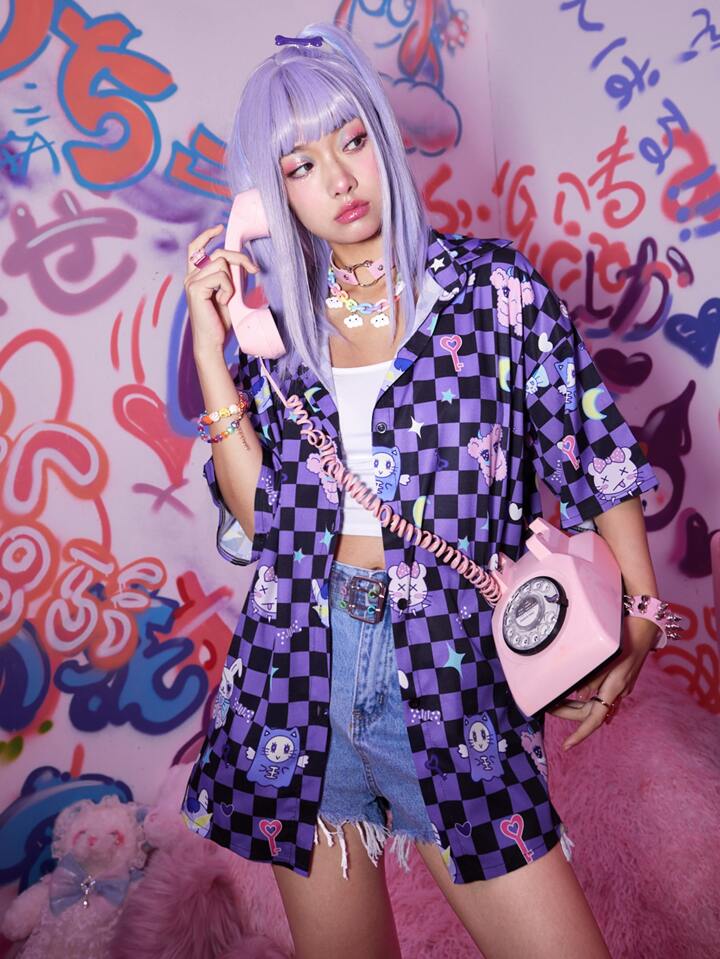 Anime Shirt mit Cartoon Muster, Schachbrett Knopf vorne