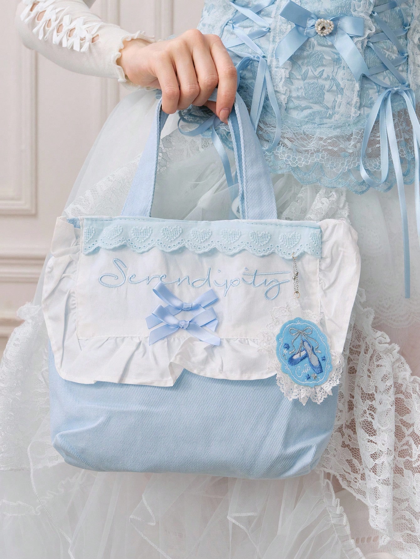 Anime Lolita Kawaii Buchstaben Stickerei Spitze & Herz Blumen Patchwork blau & weiß Ballett Schuhe Handtaschen Anhänger, passend für Lässig Ausflüge und Lolita Modezubehör
