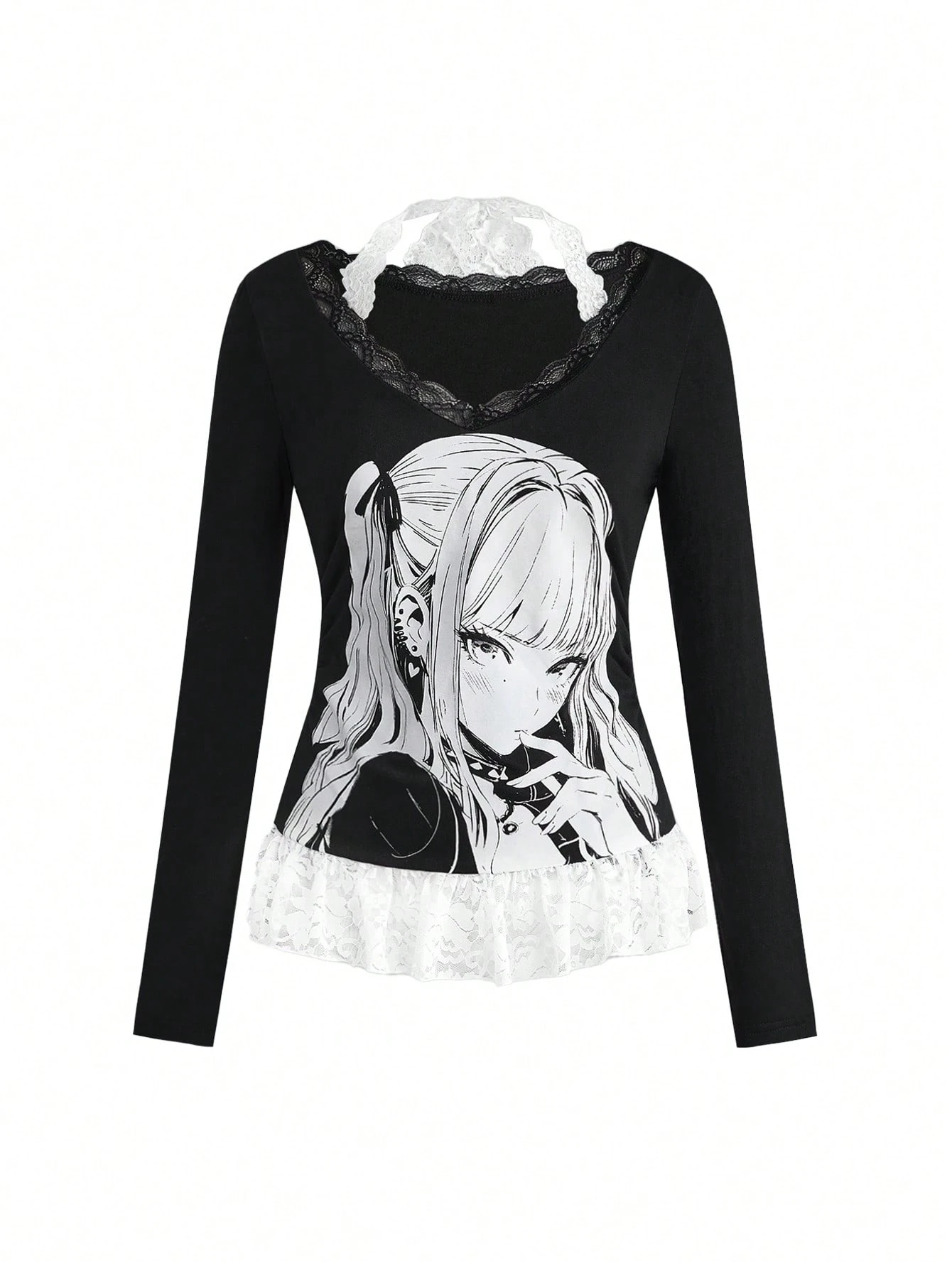 Anime Medizinisches Thema Muster Kontrast Spitze Langarm 2 in 1 T-Shirt (beinhaltet Spitzen-Trägerhemd und Spitzen-Saum Patchwork)