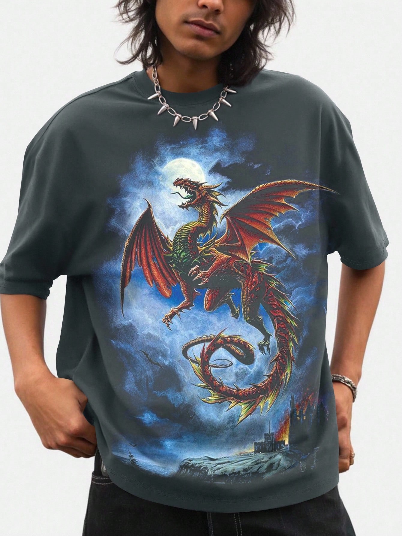 Herren T-Shirt mit Rundhalsausschnitt, Druckmotiv Drache, kurzärmelig, vielseitig für den Sommer