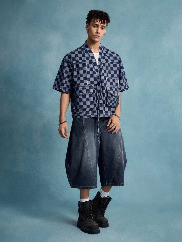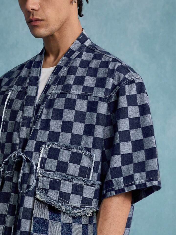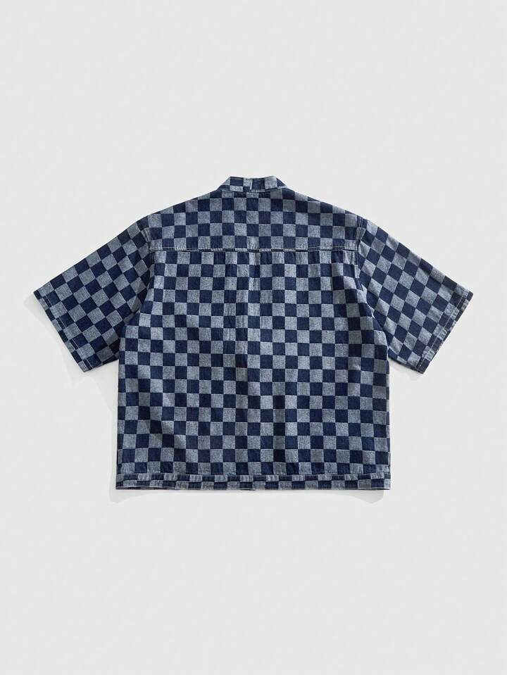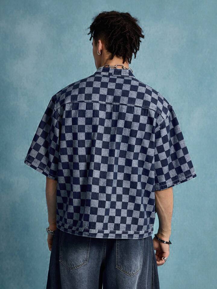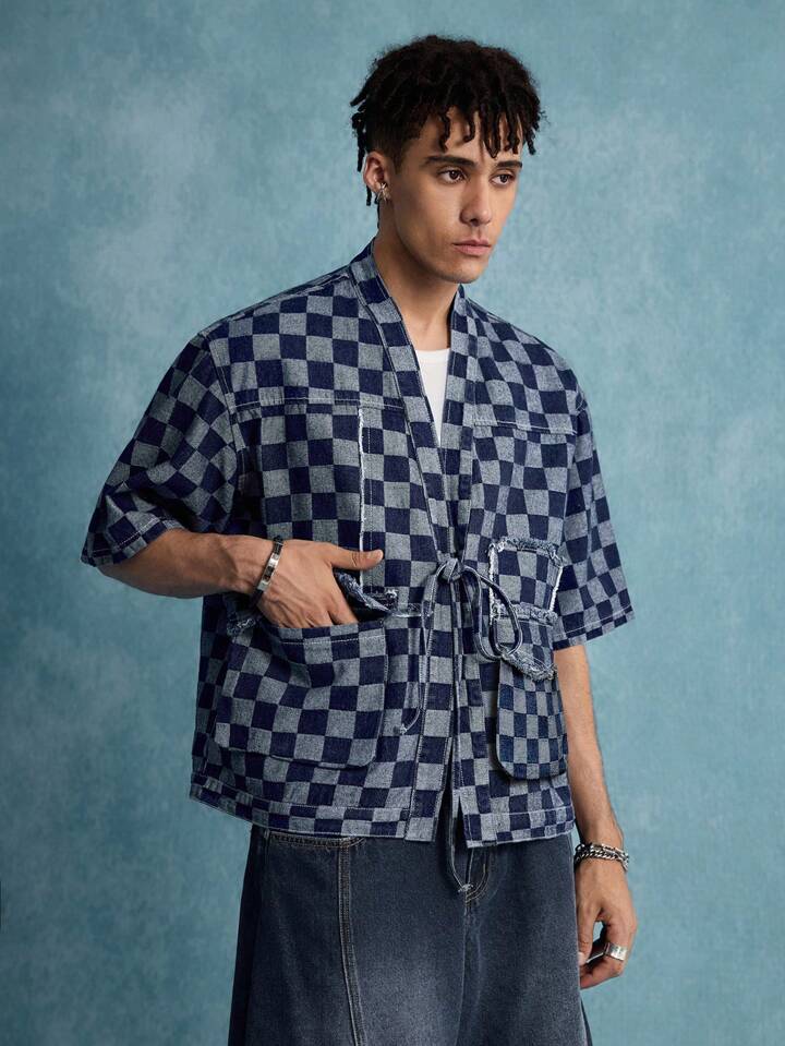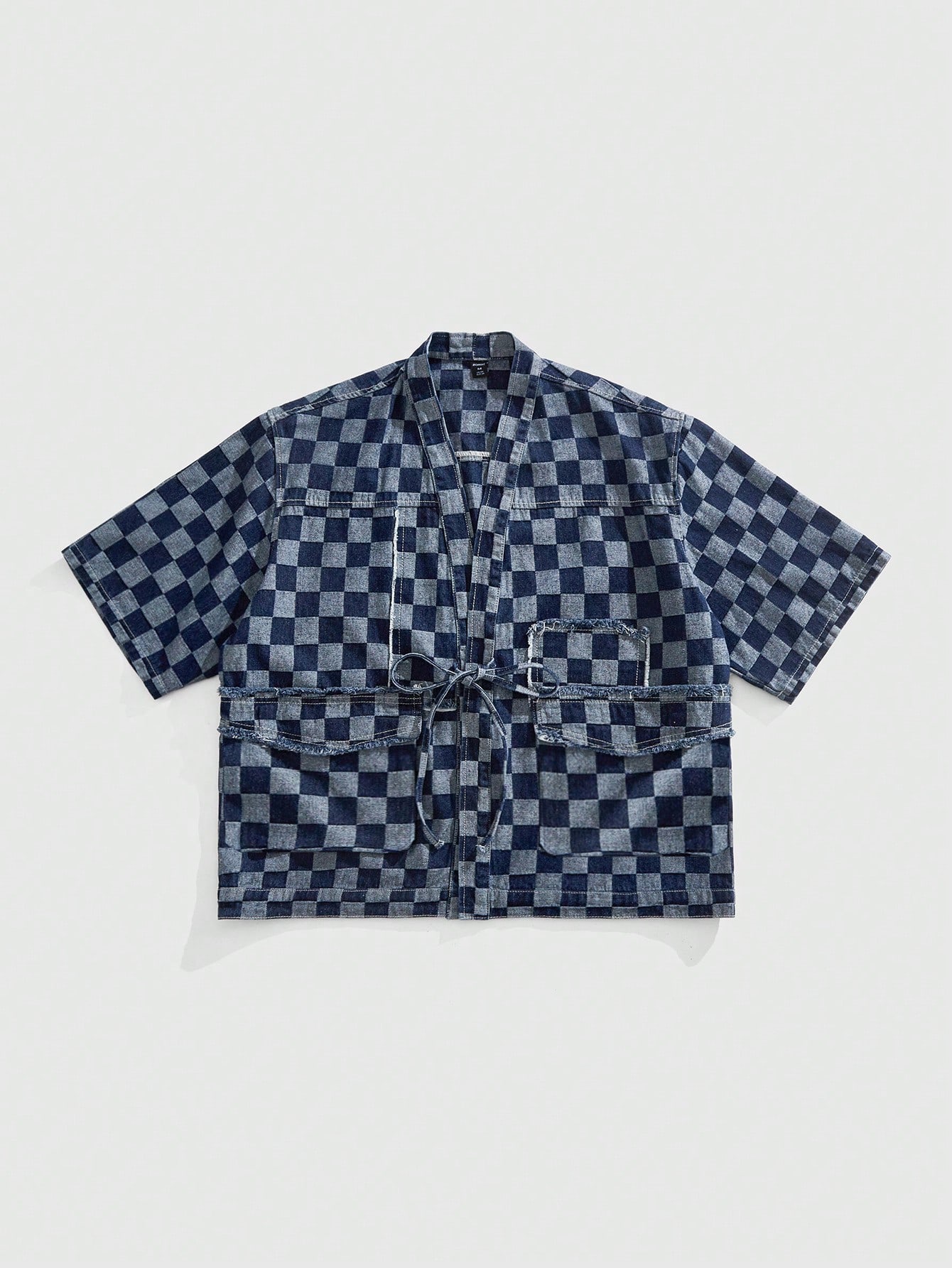Anime Herren lässiges Jeanshemd mit Vorderteil-Karo-Muster und Krawatte, kurzärmlig, Sommer