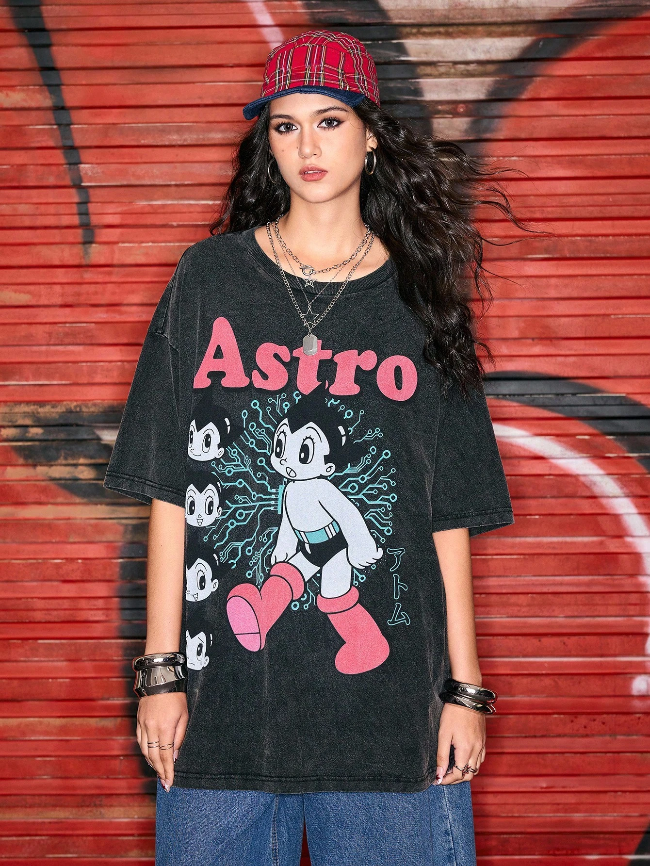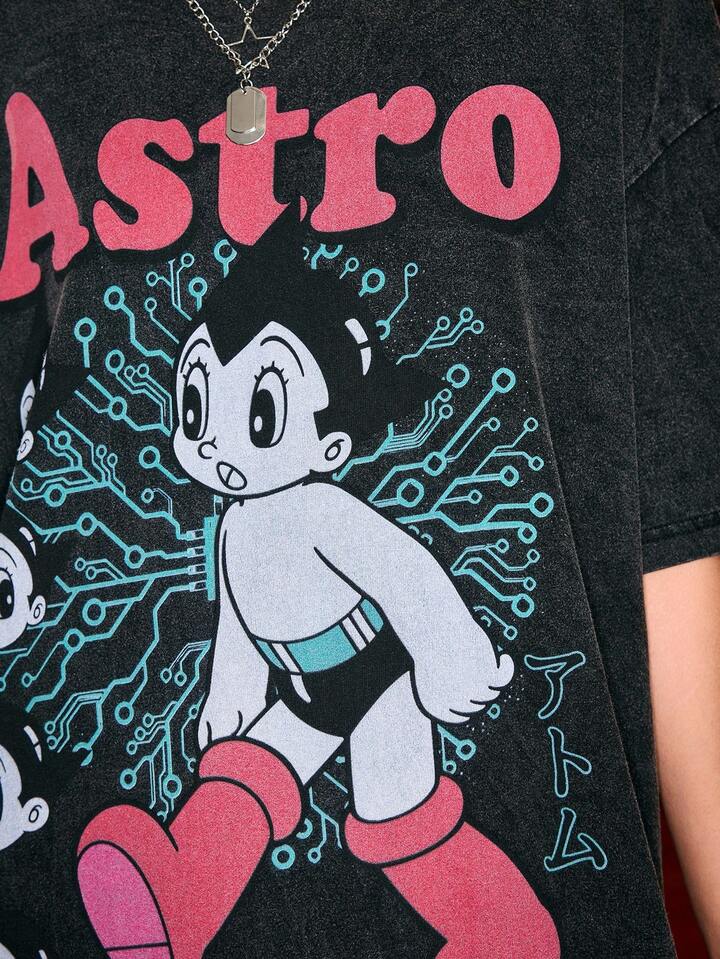 Astro Boy X ROMWE Damen Loose T-Shirt mit Cartoon- und Buchstabenmuster, gewaschene Schneeflocke