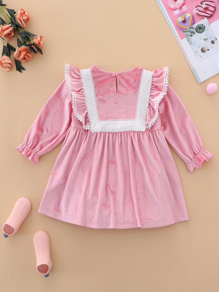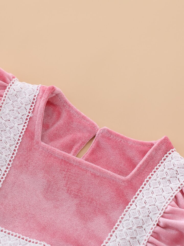 Samt Kleid mit Kontrast-Spitzen und Rüschenbesatz
