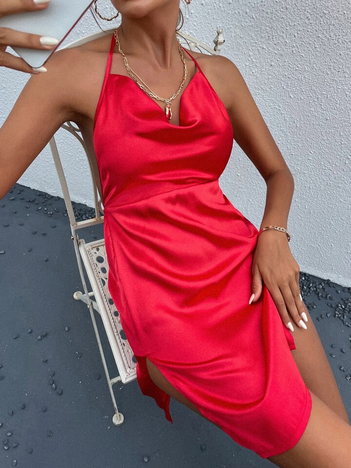 Satin Kleid mit Schlitz am Saum und Neckholder