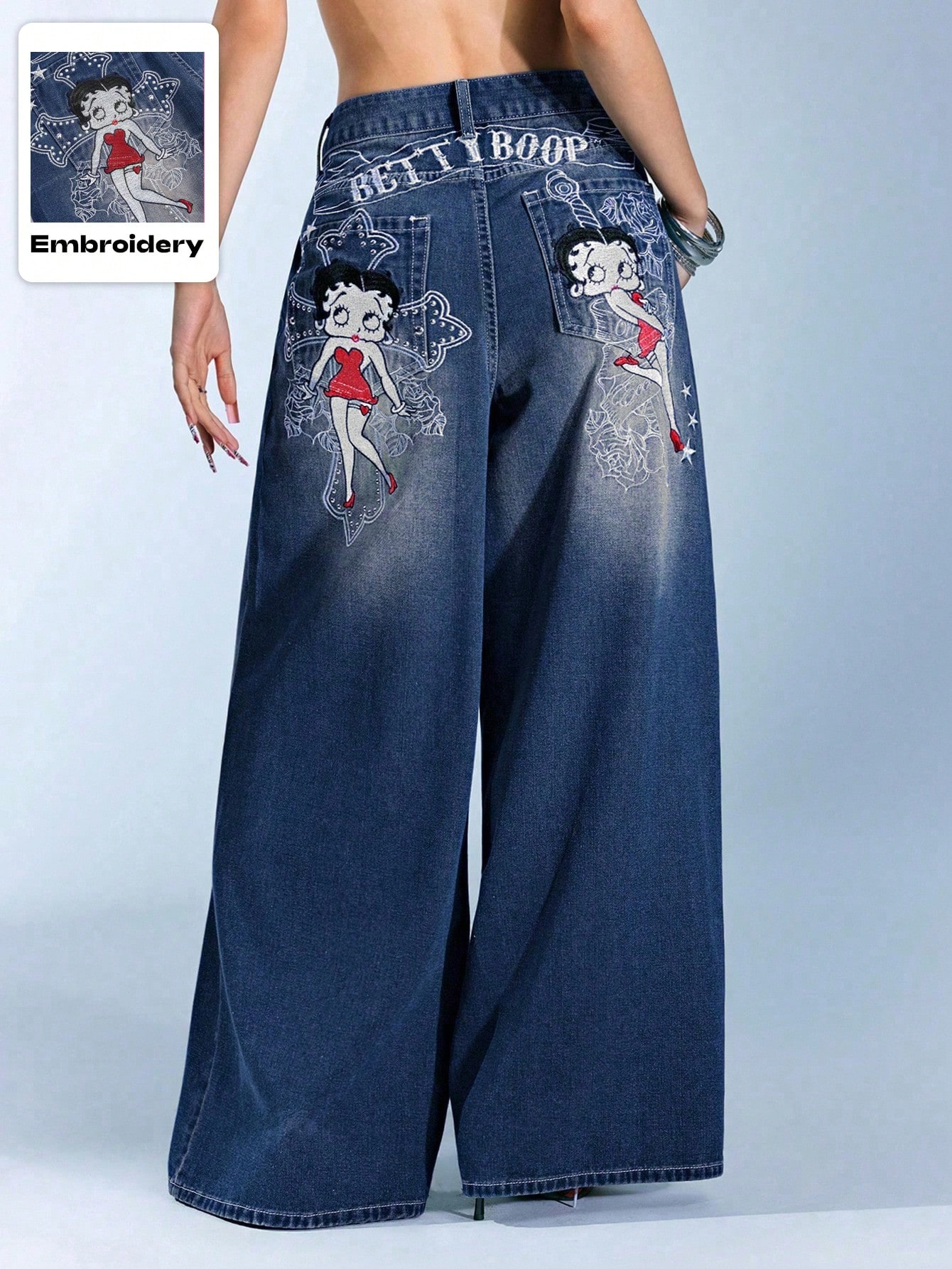 Betty Boop | ROMWE Muster Stickerei mit gotischem Kreuz & Weinrose, verwaschen, überschnittene gerade geschnittene extra lange Y2K Jeans