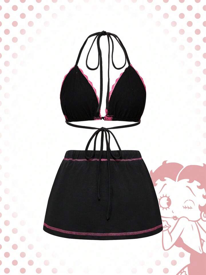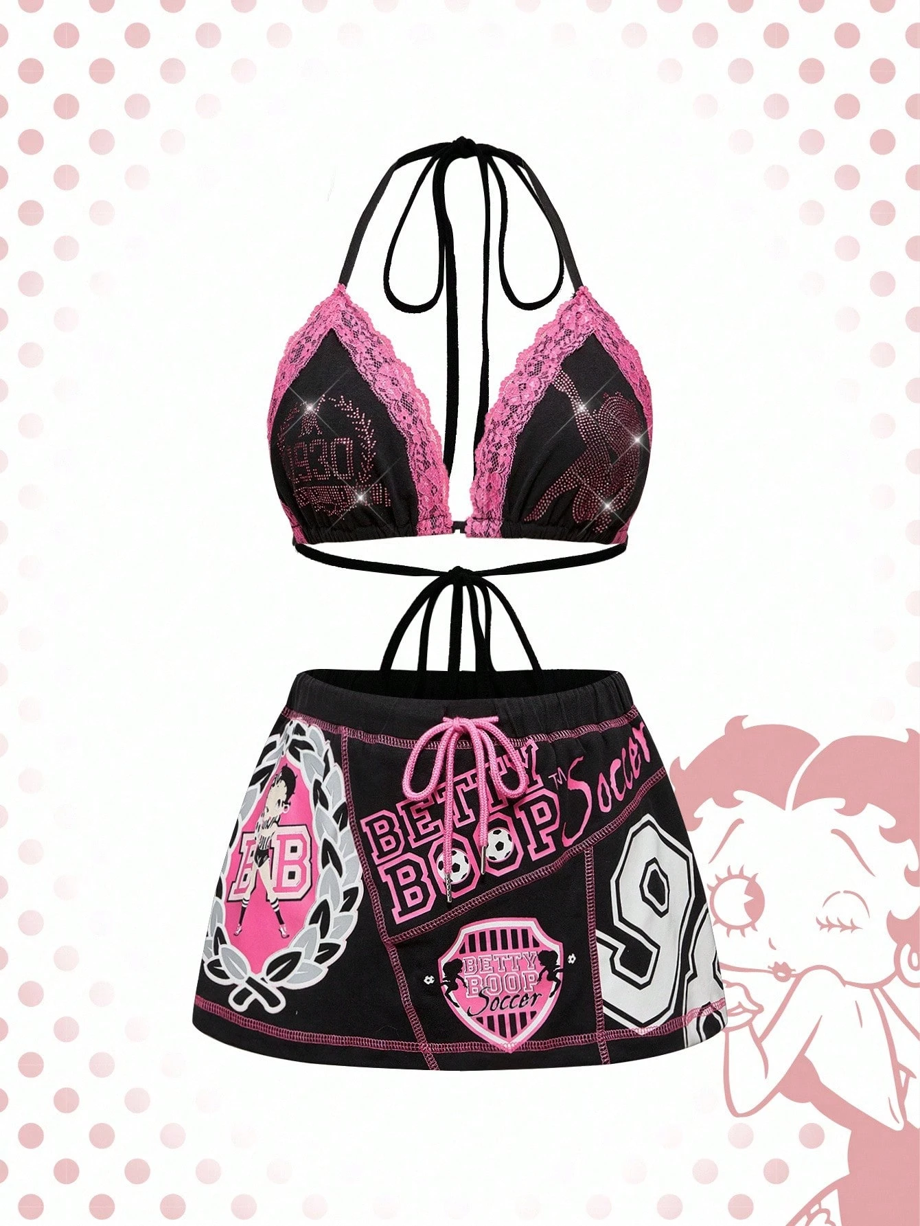 Betty Boop | ROMWE Damen Cartoon Figur Grafik Fußball Sport Sexy Strass Träger Crop Top und Minirock mit niedriger Taille 2-teiliges Set