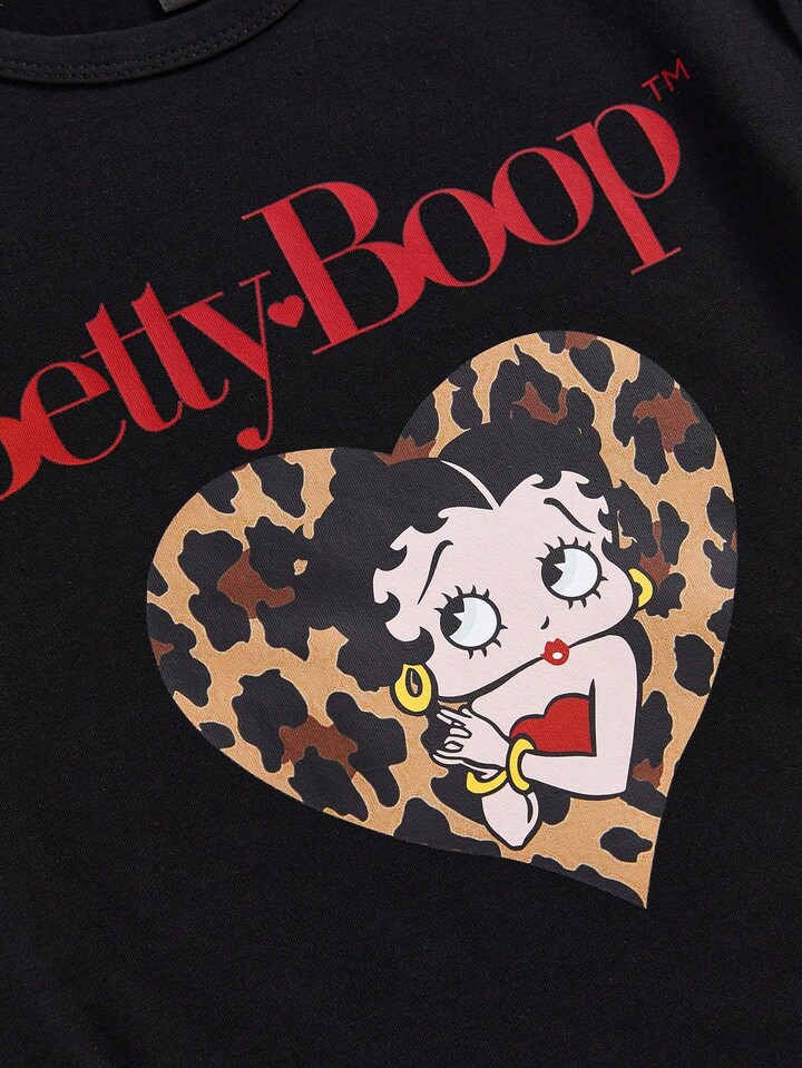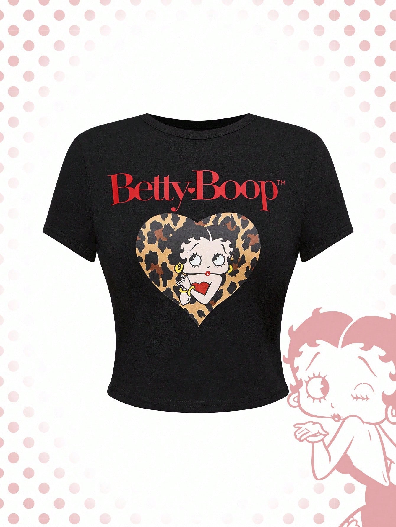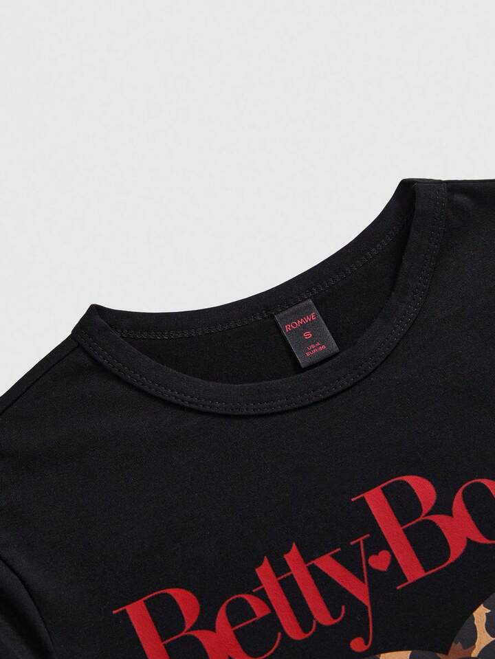 Betty Boop | ROMWE Damen T-Shirt mit Buchstaben- und Cartoon-Motiv, enge Passform, kurzer Schnitt, Rundhalsausschnitt, Kurzarm