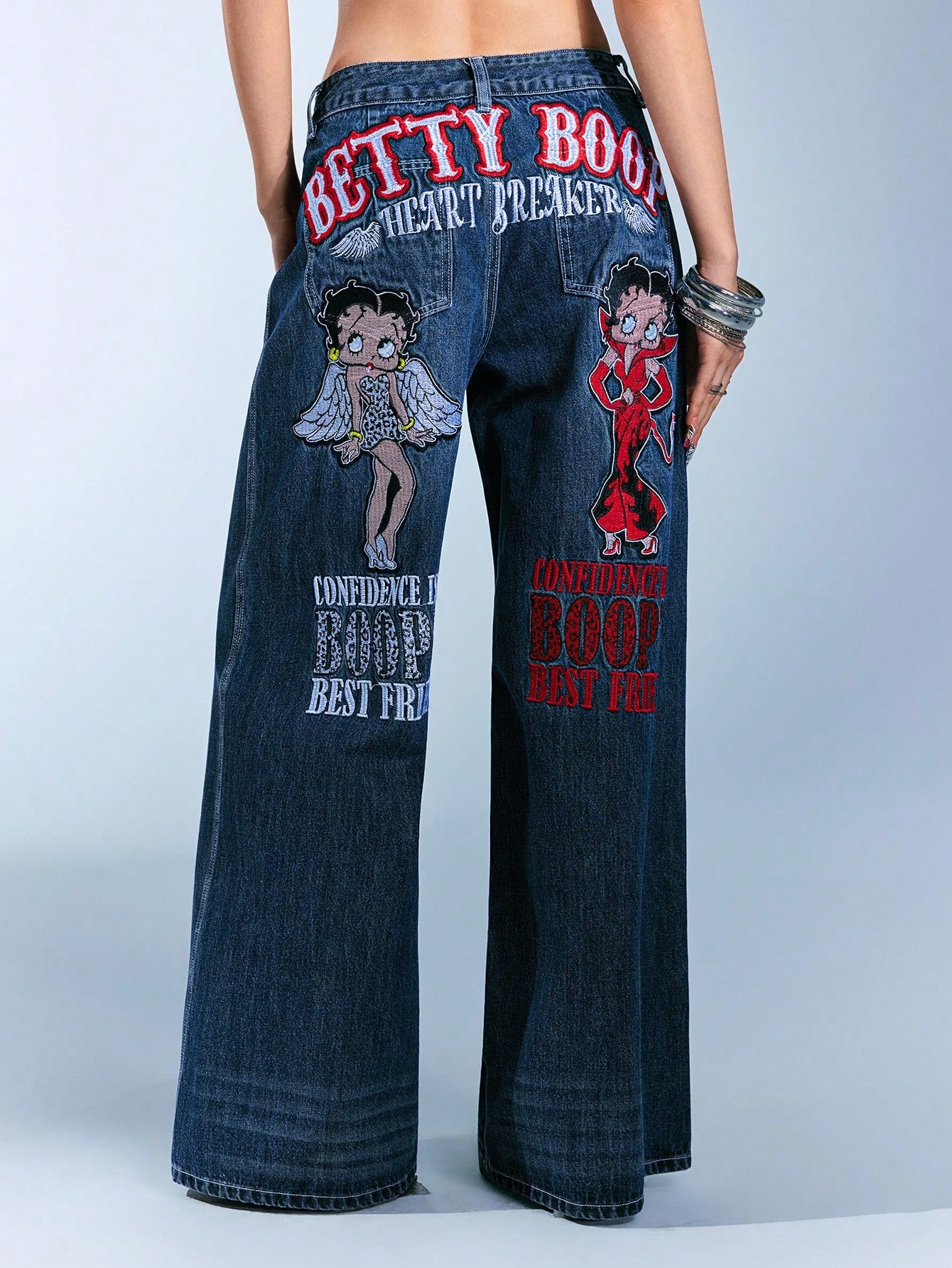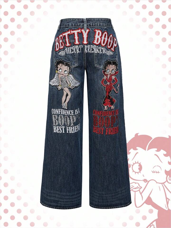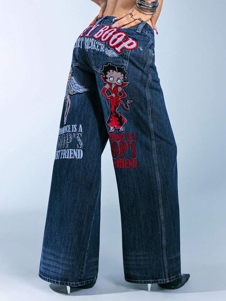 Betty Boop | ROMWE Y2K Retro Streetwear Betty Kollektion Engel Dämon Loose Fit Jeans mit niedriger Taille