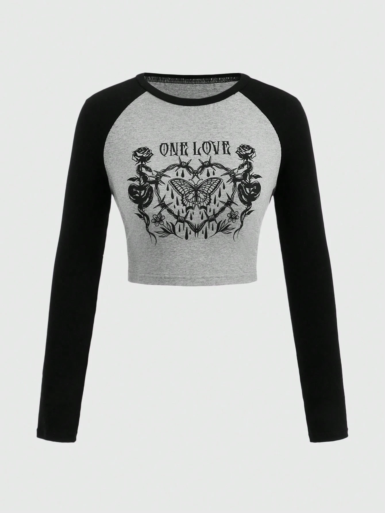 Blunt burn Frauen Farbblock T-shirt Mit Raglanärmeln, Blumen & Schmetterling Muster