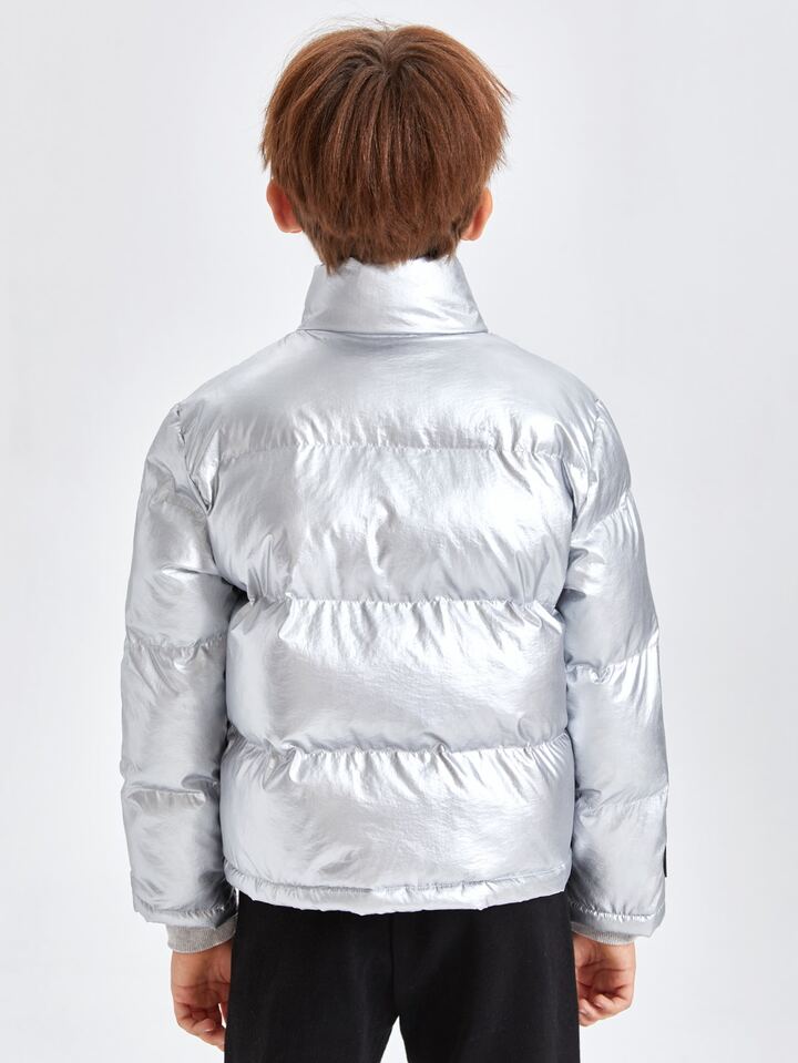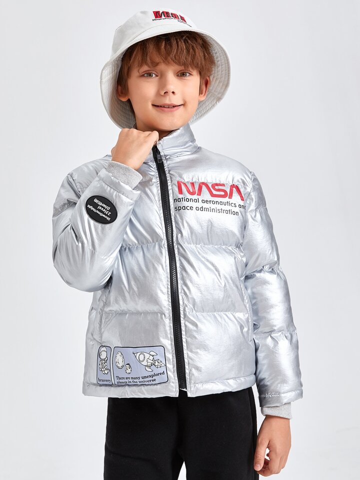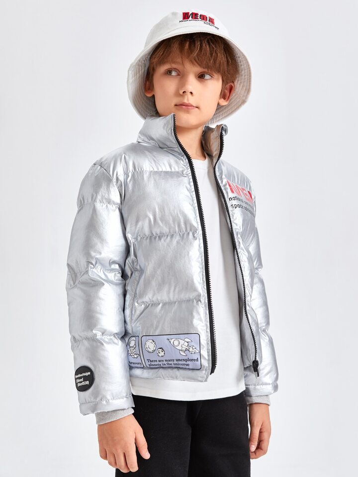 Daunenjacke mit Buchstaben Grafik, Flicken Detail und Reißverschluss