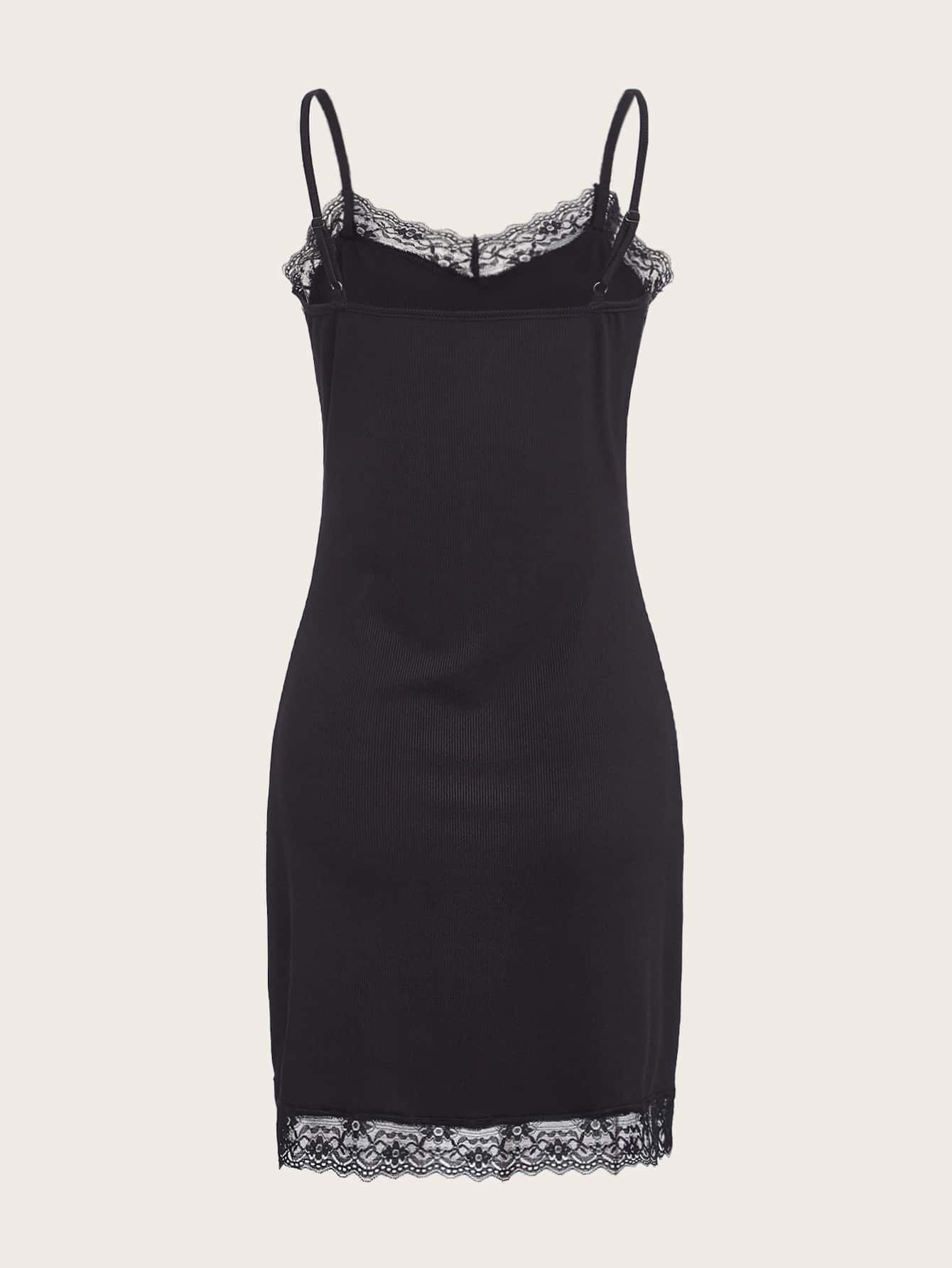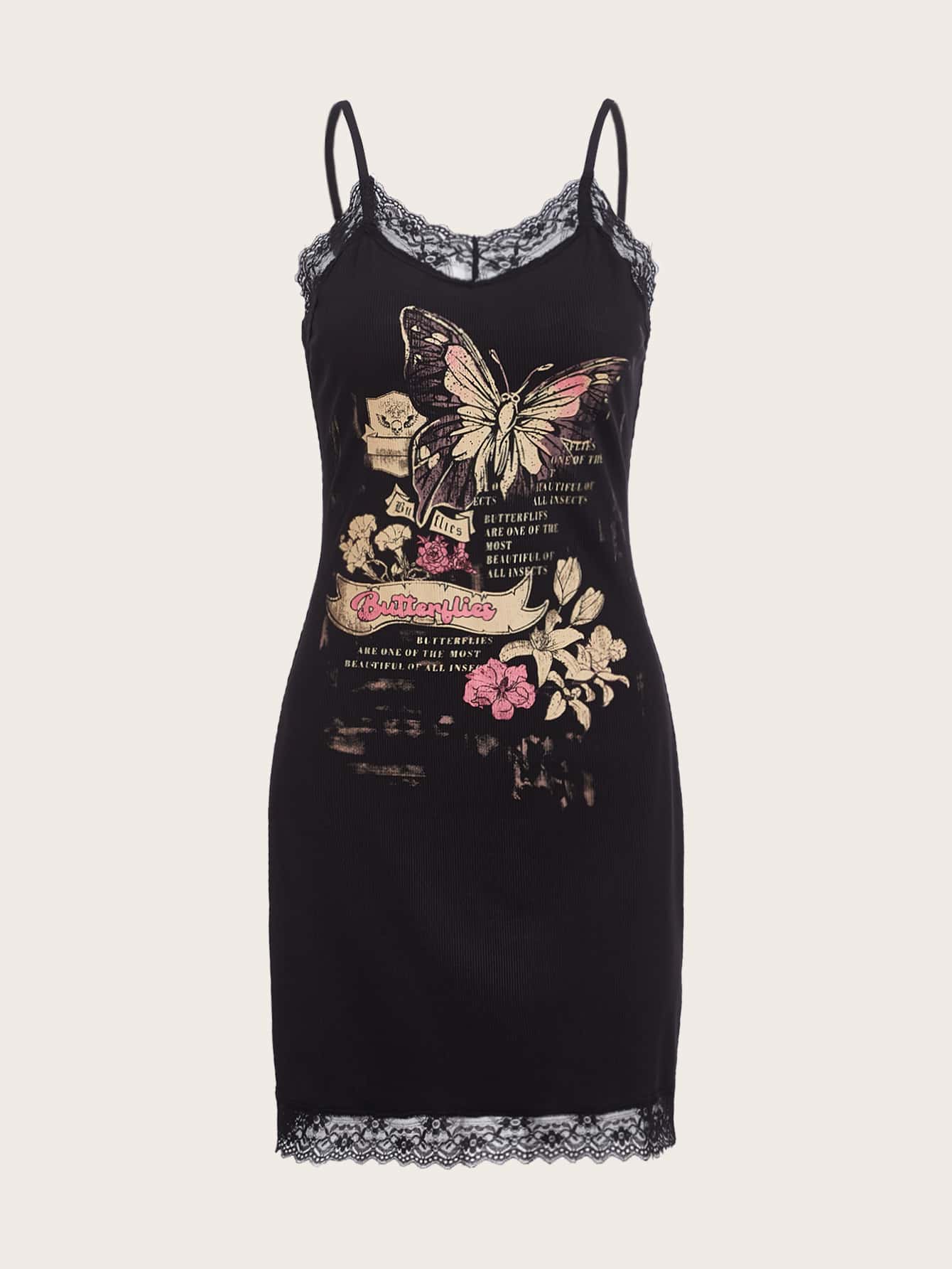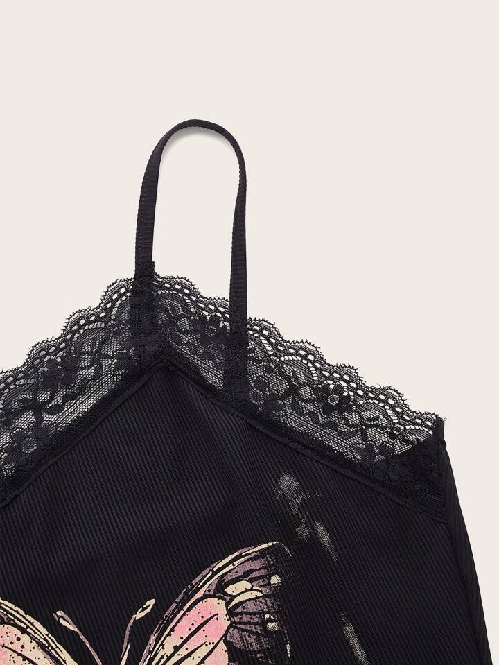 Cami Kleid mit Schmetterling & Blume Muster, Kontrast Spitzen
