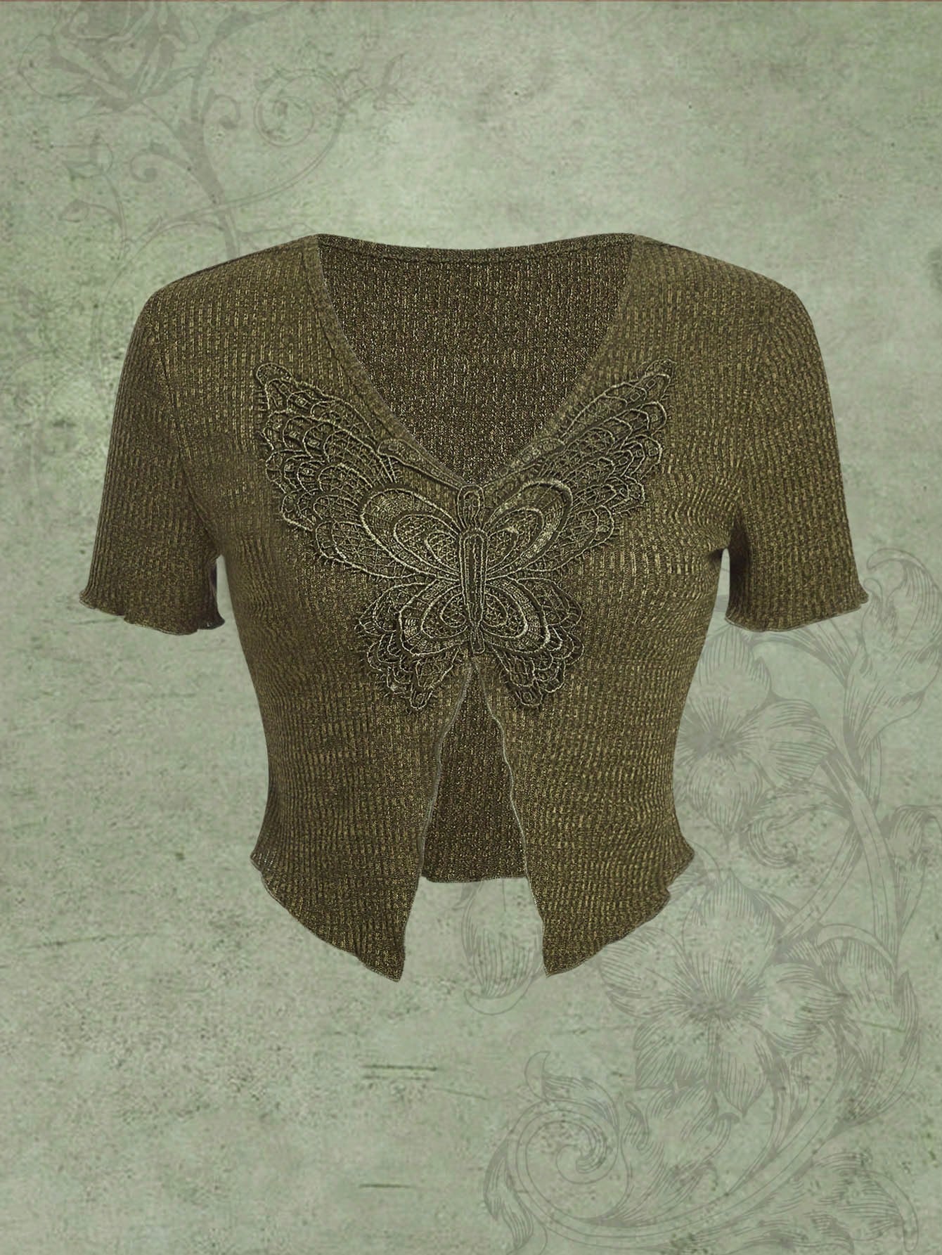 T-Shirt mit Schmetterling Flicken, Schlitz am Saum,