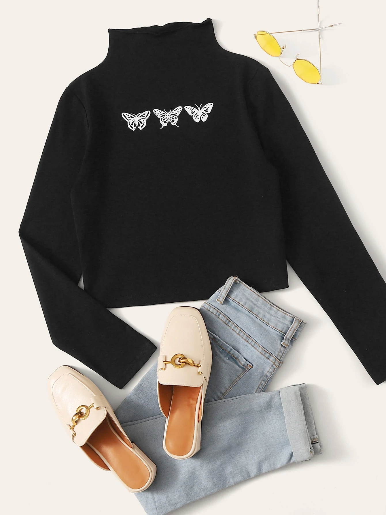 T-Shirt mit Schmetterling Muster und Stehkragen