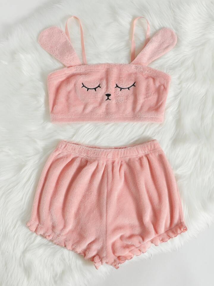 Cartoon bestickte 3D Patch Flanell Cami Pyjama Set / Flauschiger Pyjama Set Feiertags Saison, Herbst Winter Kleidung, Gemütlich