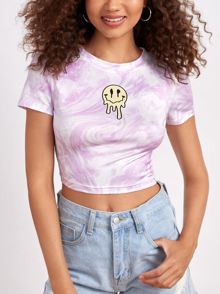 Crop T-Shirt mit Cartoon Grafik, Batik
