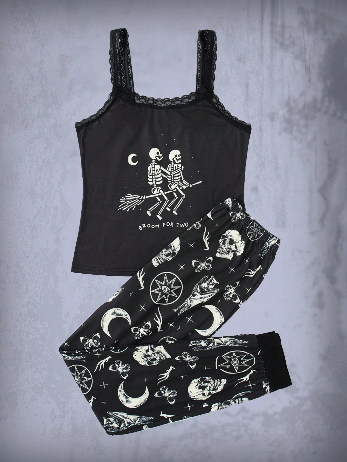 Catsneeze Pyjama Set mit Schädel Muster, Kontrast Spitzen,