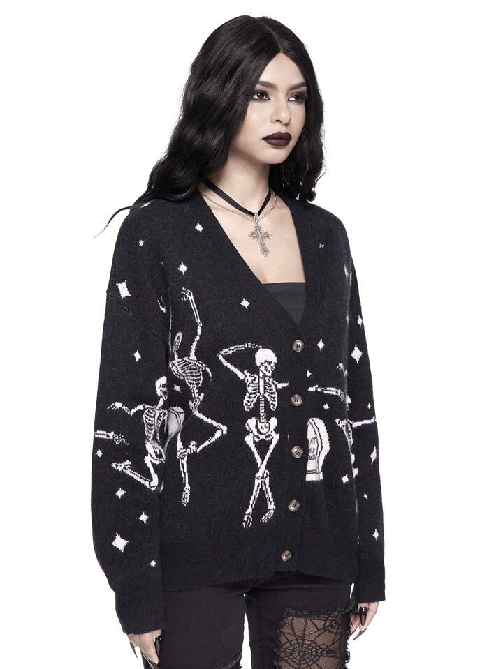 Weihnachtlicher Gothic Tanzen Skelett Grafik V-Ausschnitt lose Strickjacke für Frauen