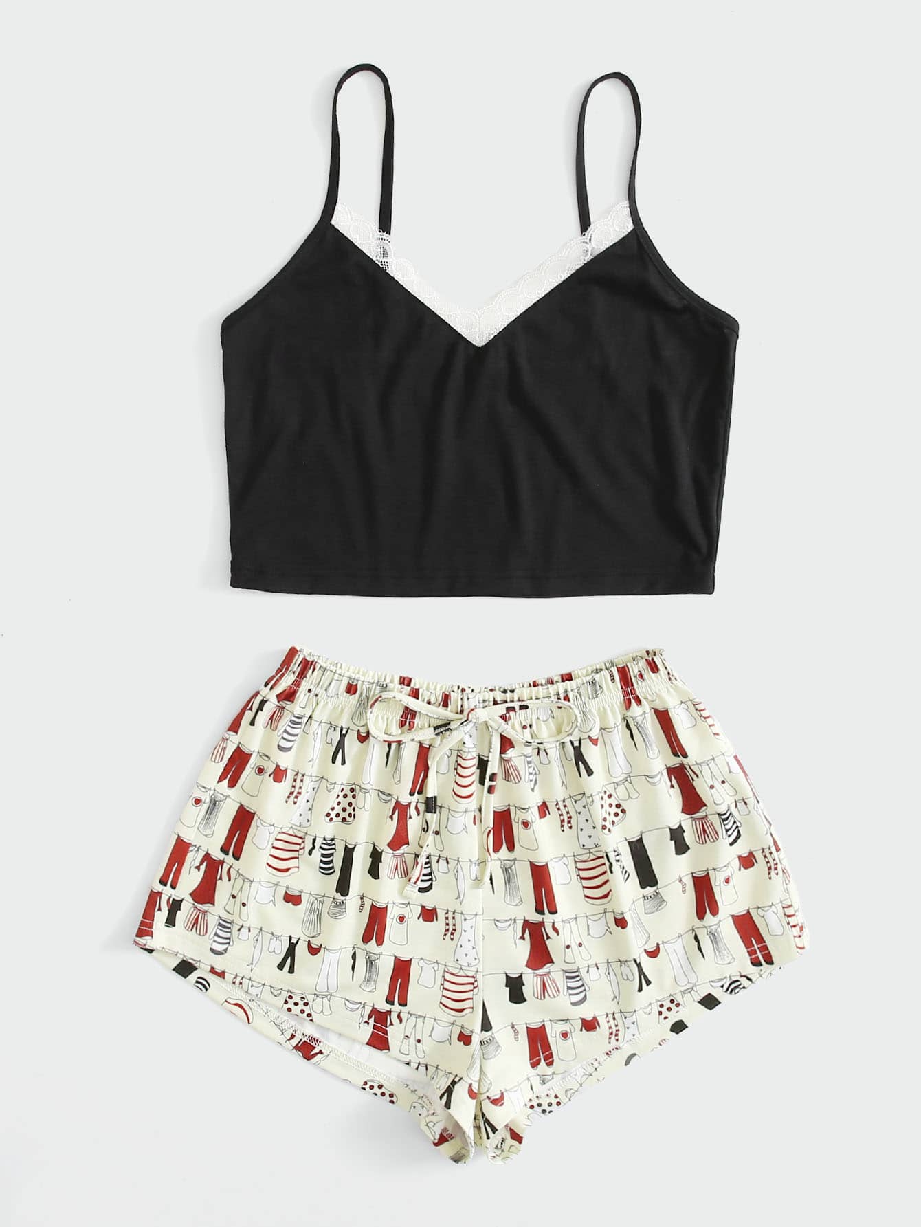 Pyjama Set mit Kleider Muster und Spitzenbesatz