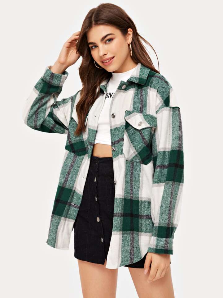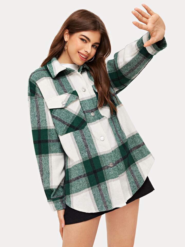Mantel mit Kragen, sehr tief angesetzter Schulterpartie, Taschen Klappen vorn und Karo Muster