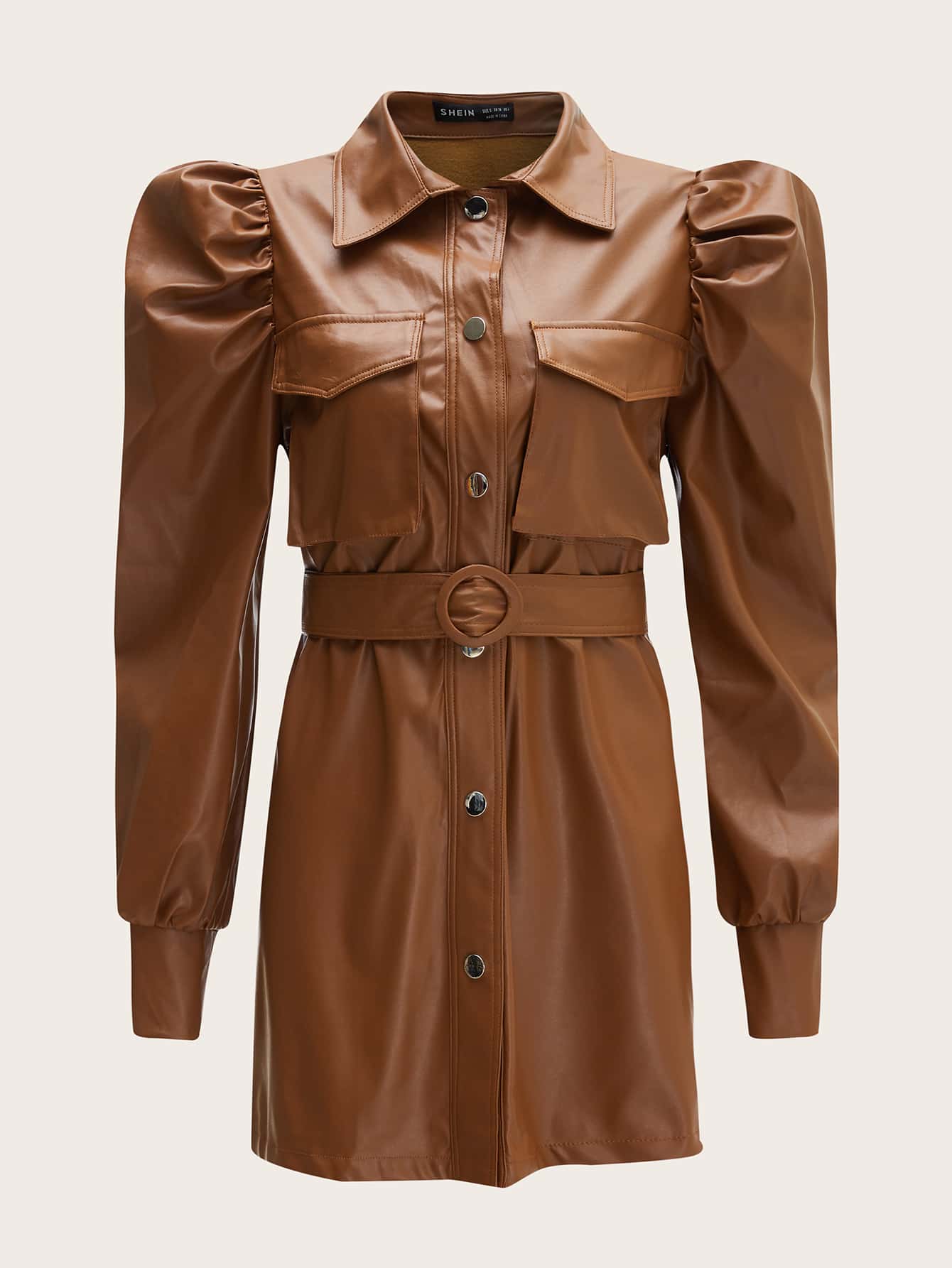 PU Leder Mantel mit Puffärmeln, Taschen vorn, O-Ring und Gürtel