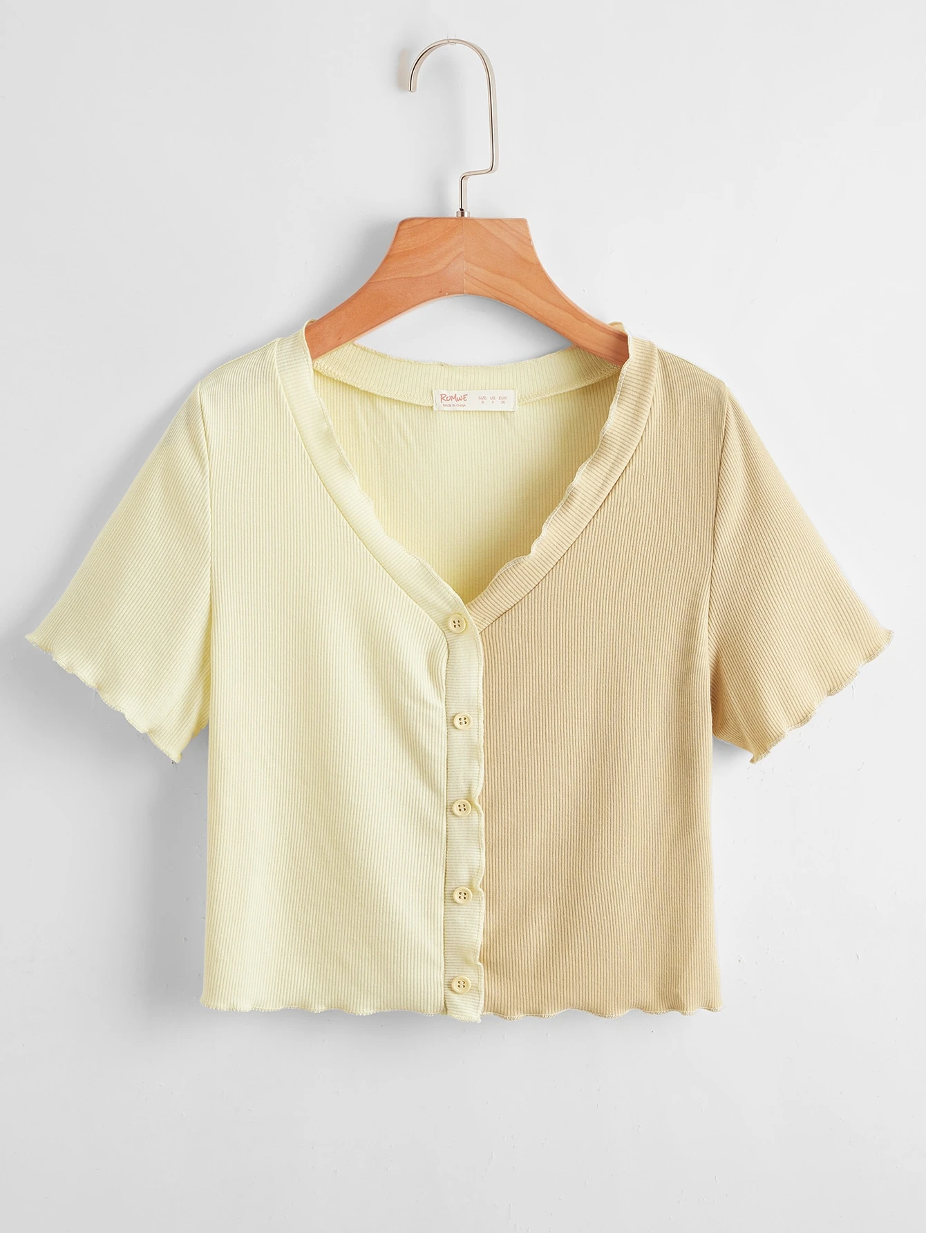 T-Shirt mit Farbblock, Wellensaum, Knopf vorne