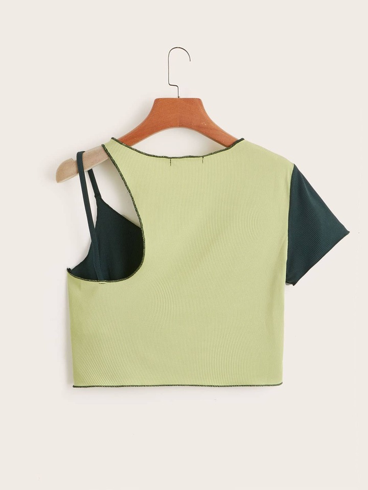 Crop T-Shirt mit Farbblock, Stich Besatz, asymmetrischem Kragen