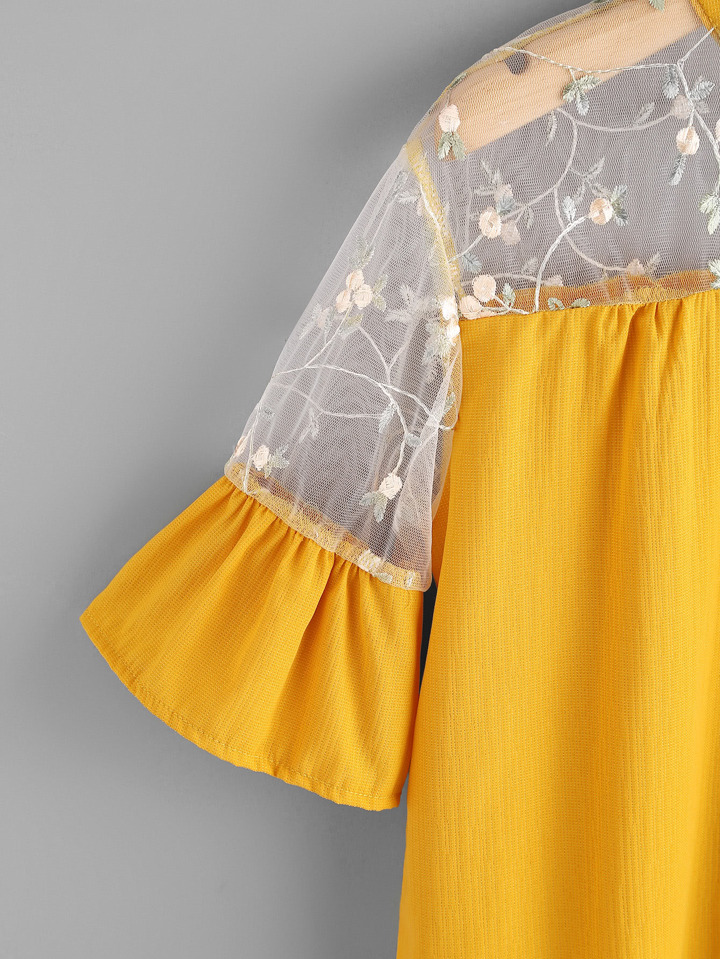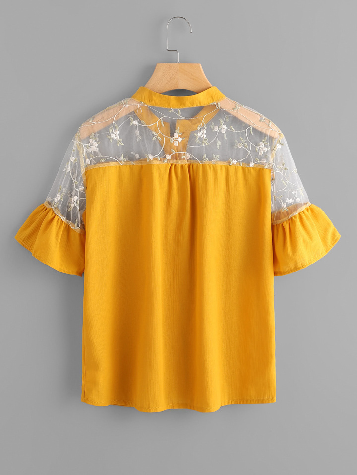Mesh Bluse an den Schultern durchsichtig und Blumen bestickt