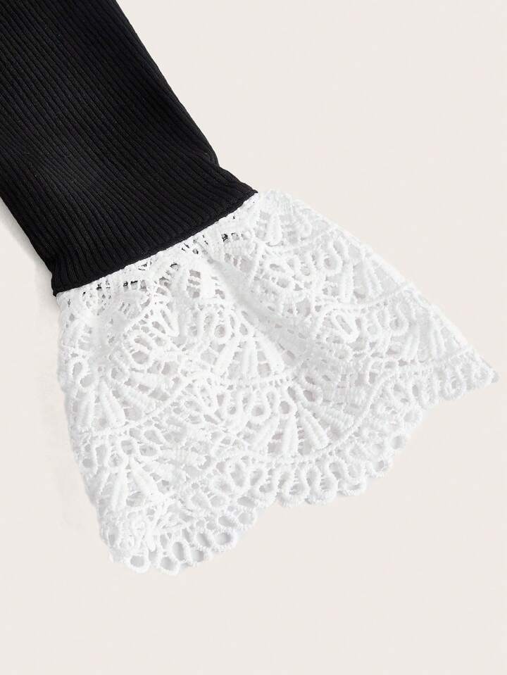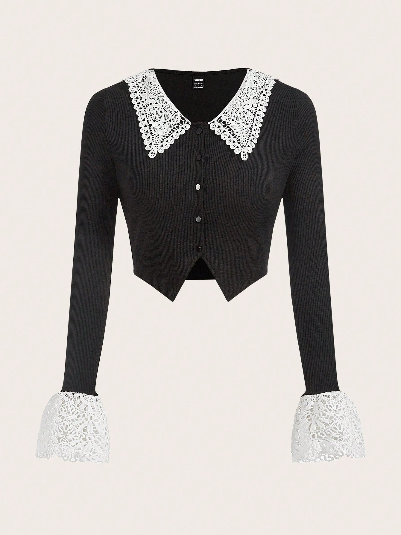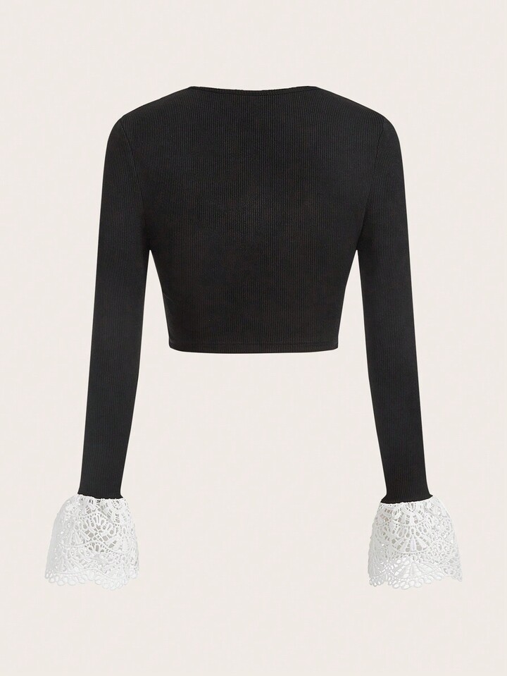 Crop T-Shirt mit Kontrast Spitzen, Umlegekragen, augestellten Ärmeln, asymmetrischem Saum,