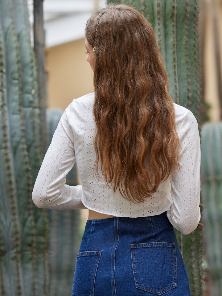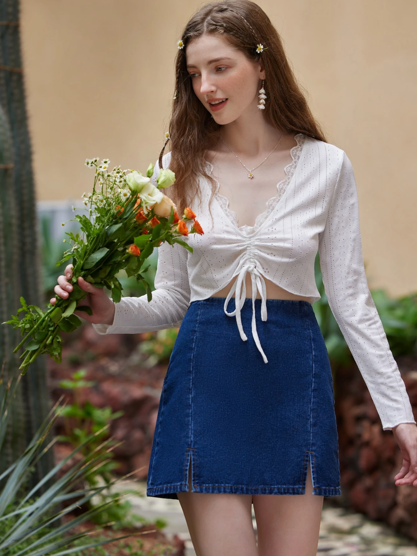 T-Shirt mit Kontrast Spitzen, Tunnelzug, Ösen Stickerei