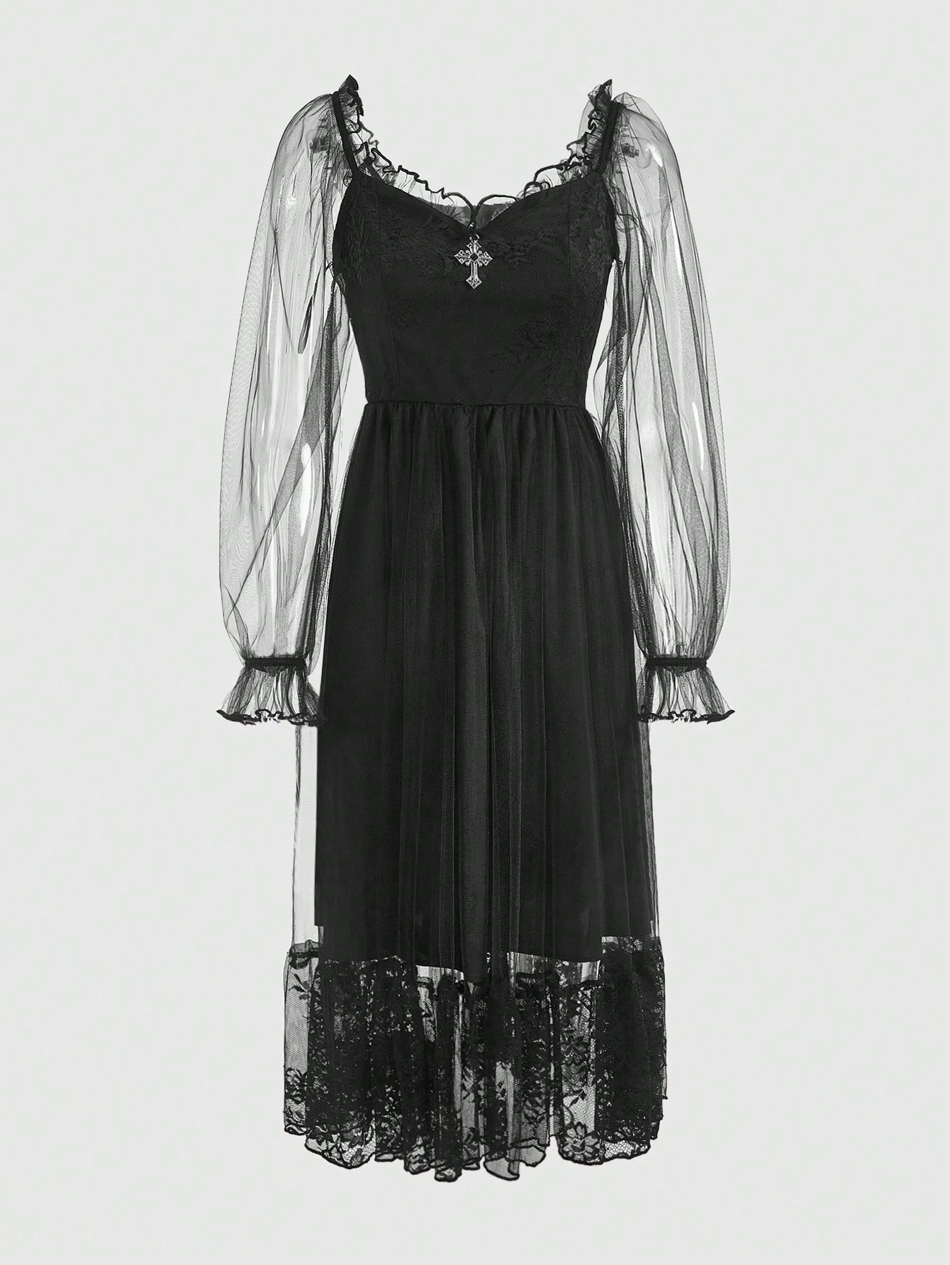 Kleid mit Kontrast Spitzen, Volant Ärmeln,