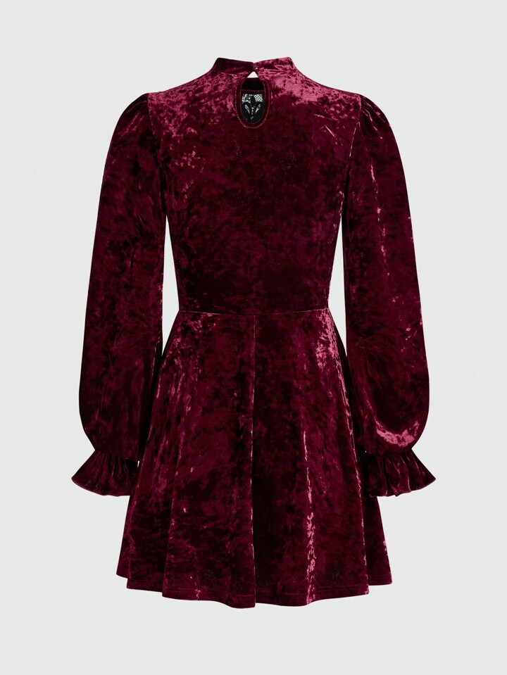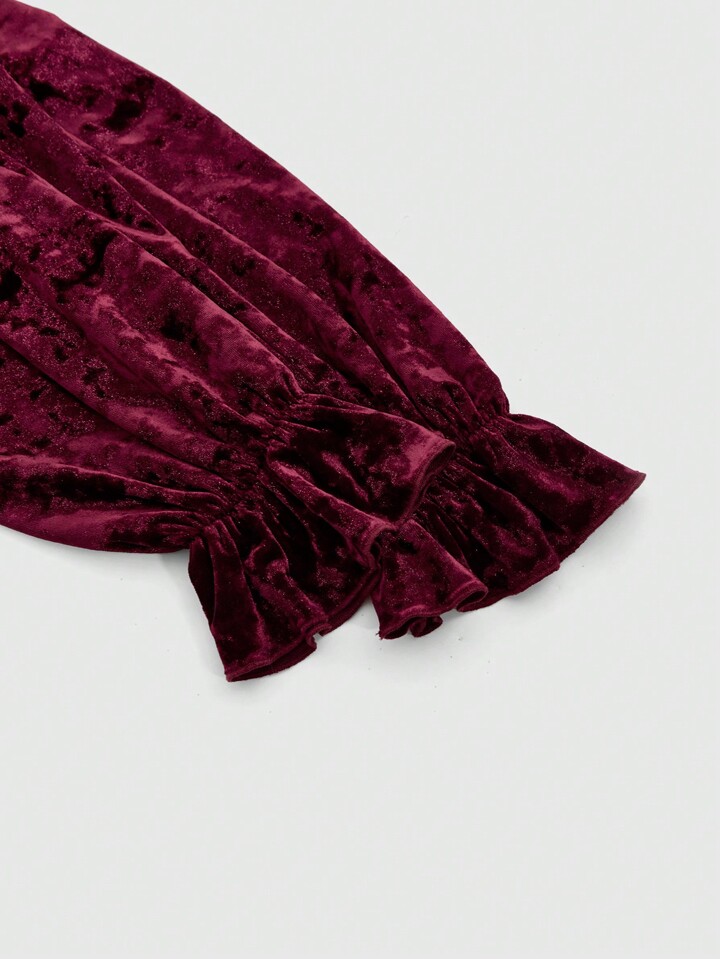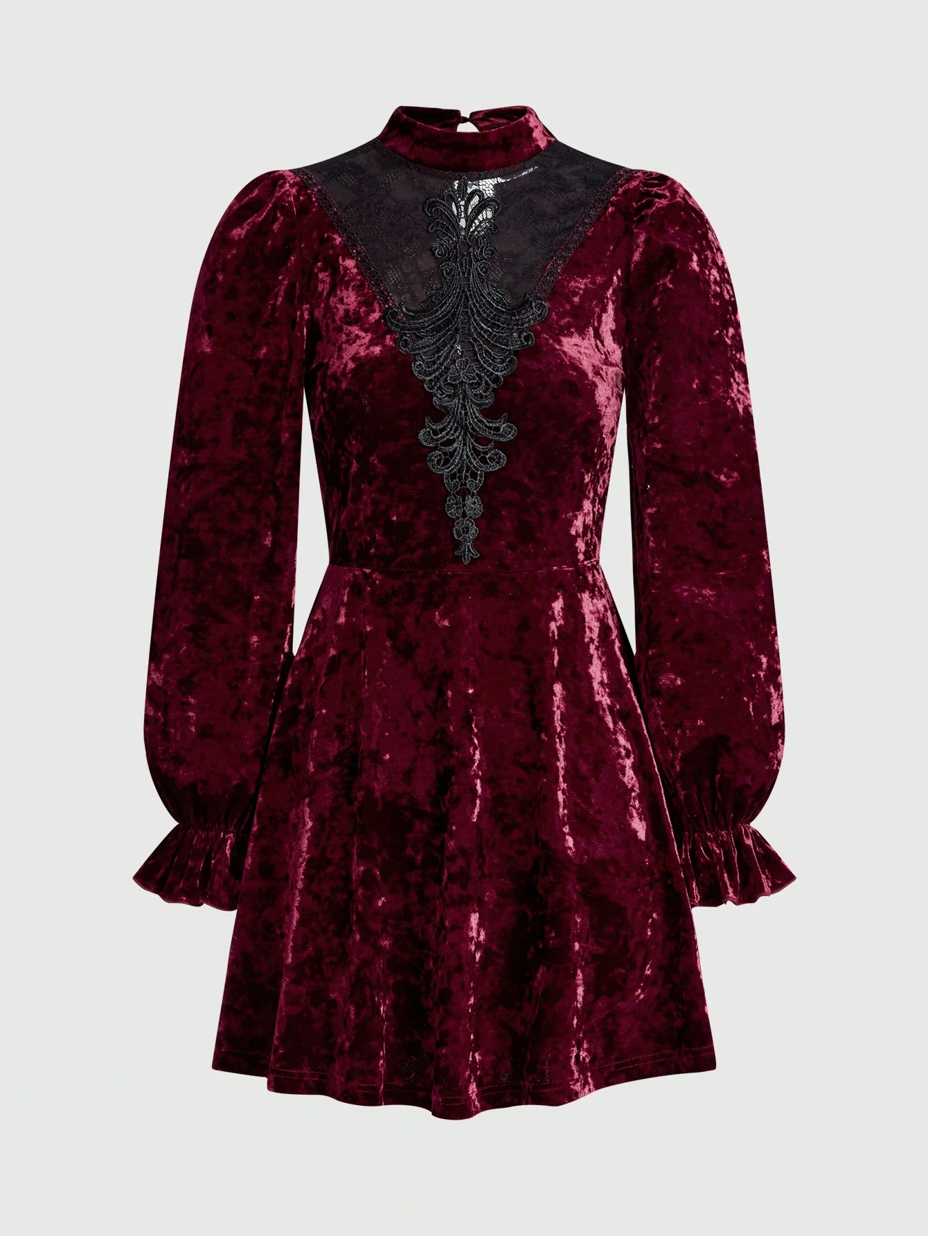 Kleid mit Kontrast Spitzen, Volant Ärmeln, Samt