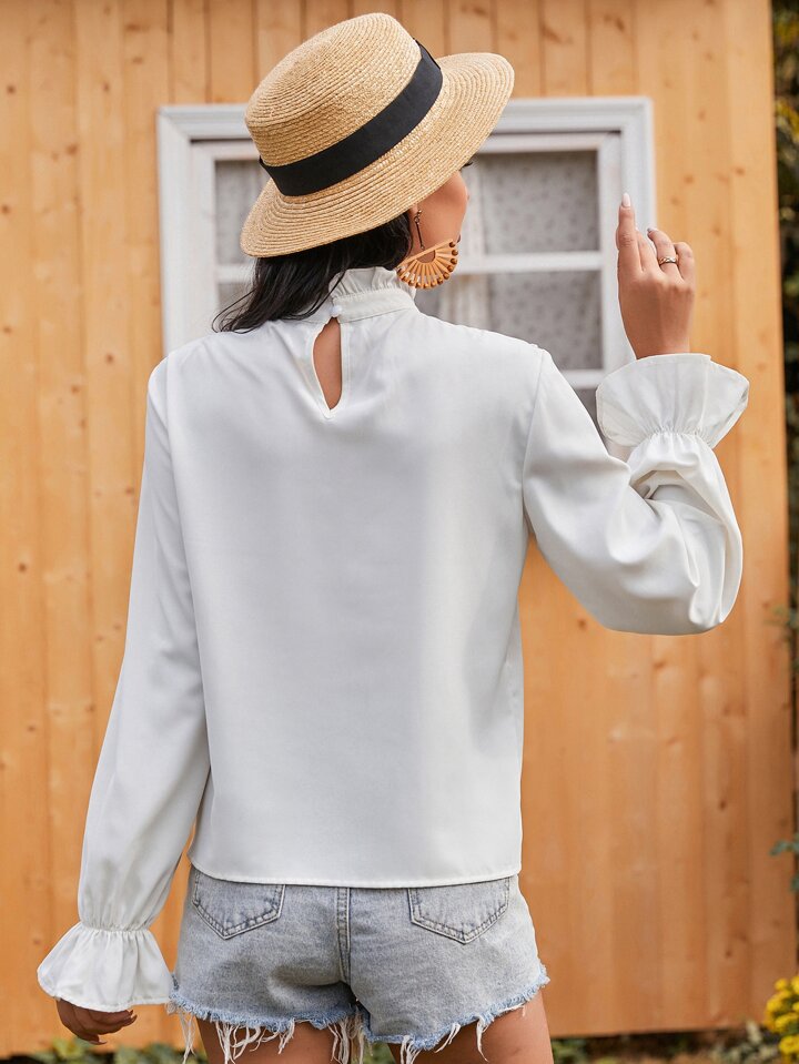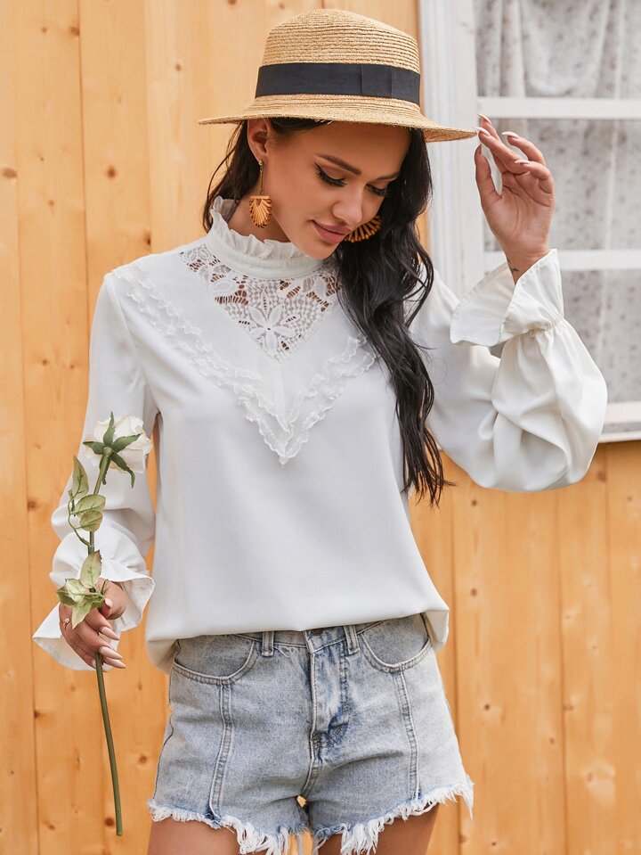 Bluse mit Kontrast Spitzen und Rüschenhals