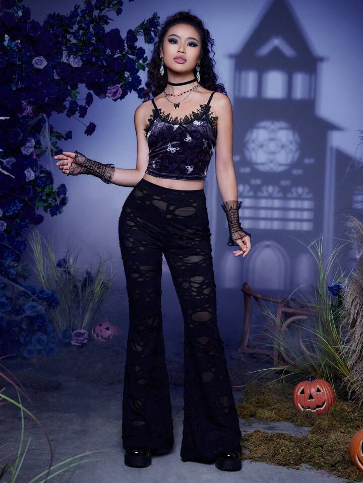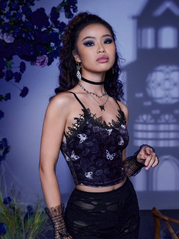 Corpse Bride | ROMWE Cami Top mit Schmetterling Muster, Kontrast Spitzen,