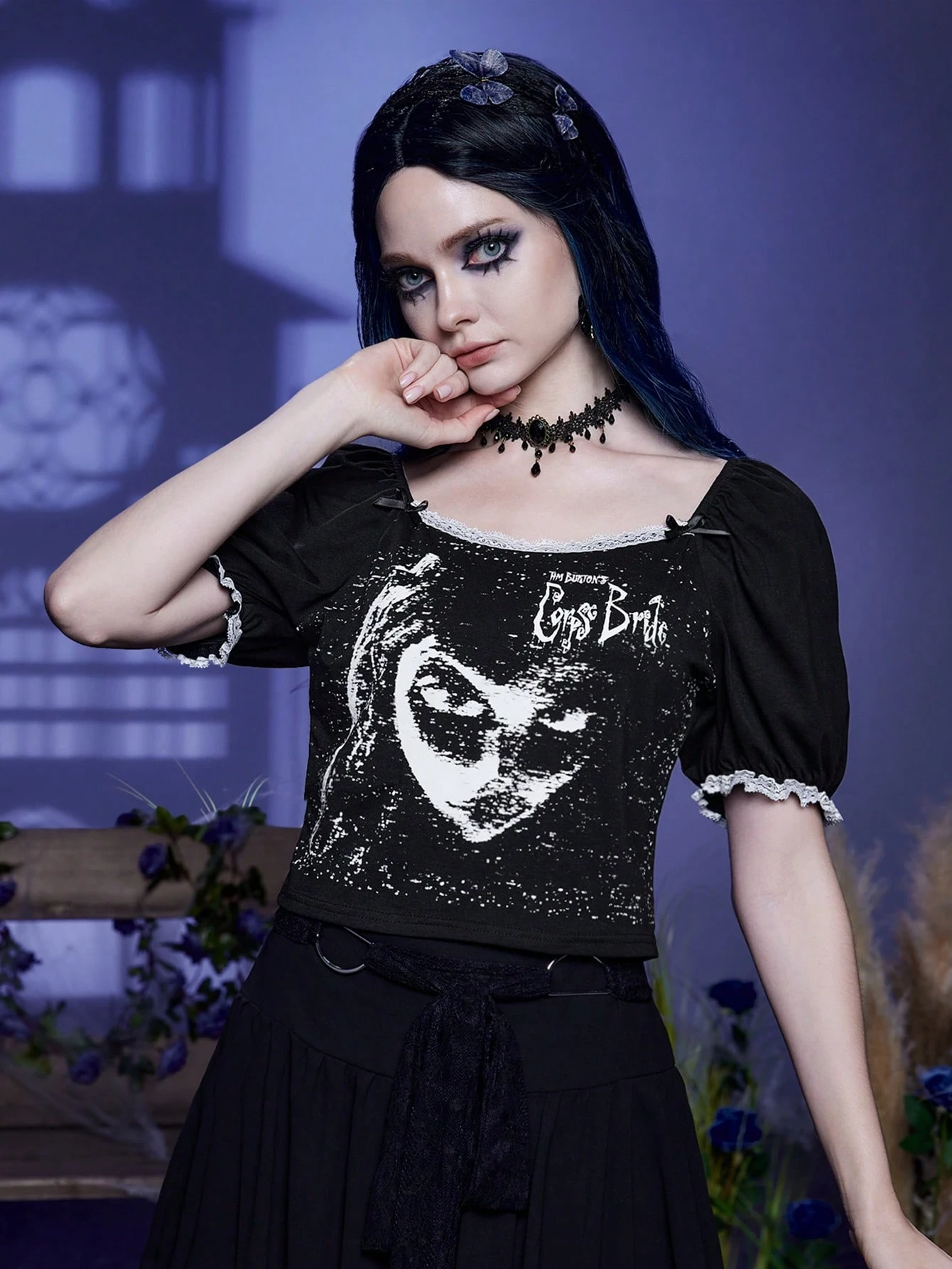 Corpse Bride | ROMWE T-Shirt mit Figur Grafik, Puffärmeln,