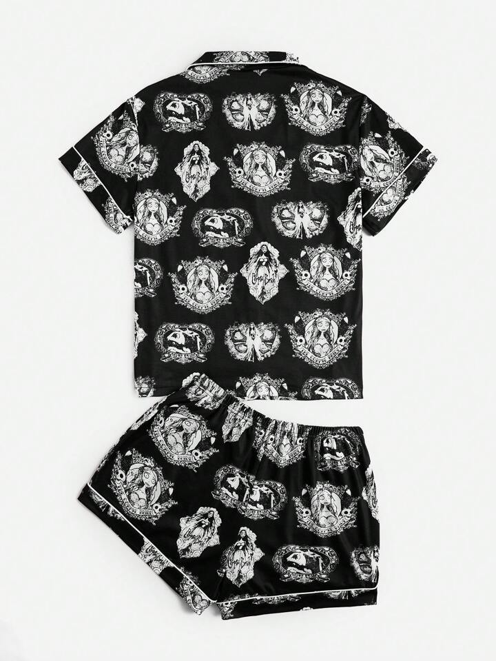 Corpse Bride | ROMWE Figuren-Muster Kontrast Bindung Schlafanzug Set, Schule