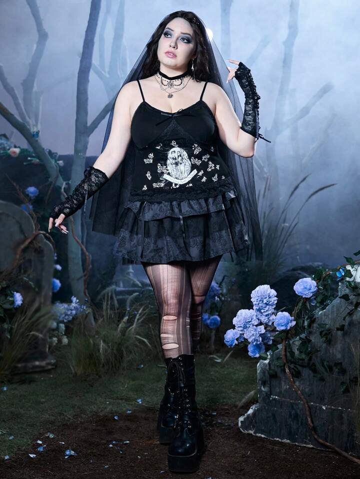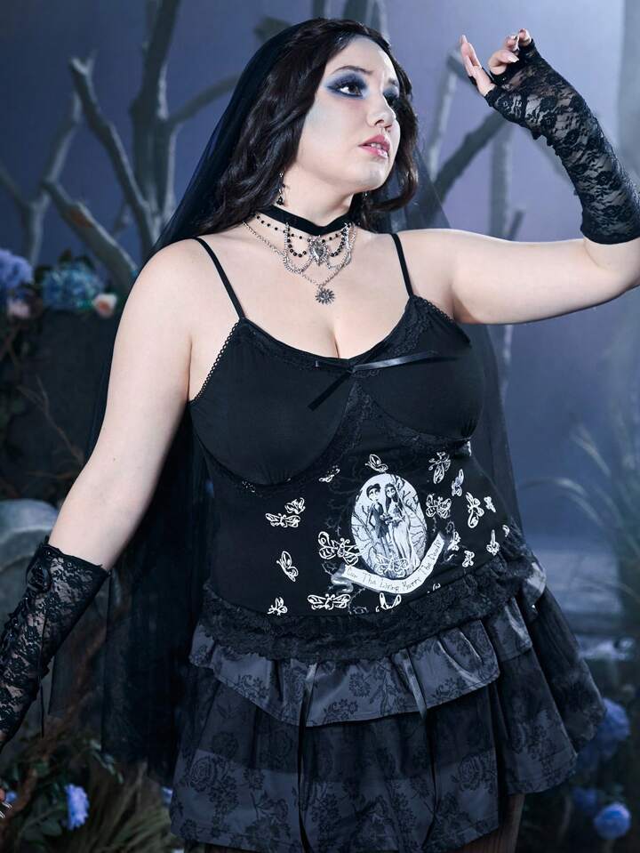 Corpse Bride | ROMWE Cami Top mit Figur Muster, Schleife vorne, Spitzenbesatz,