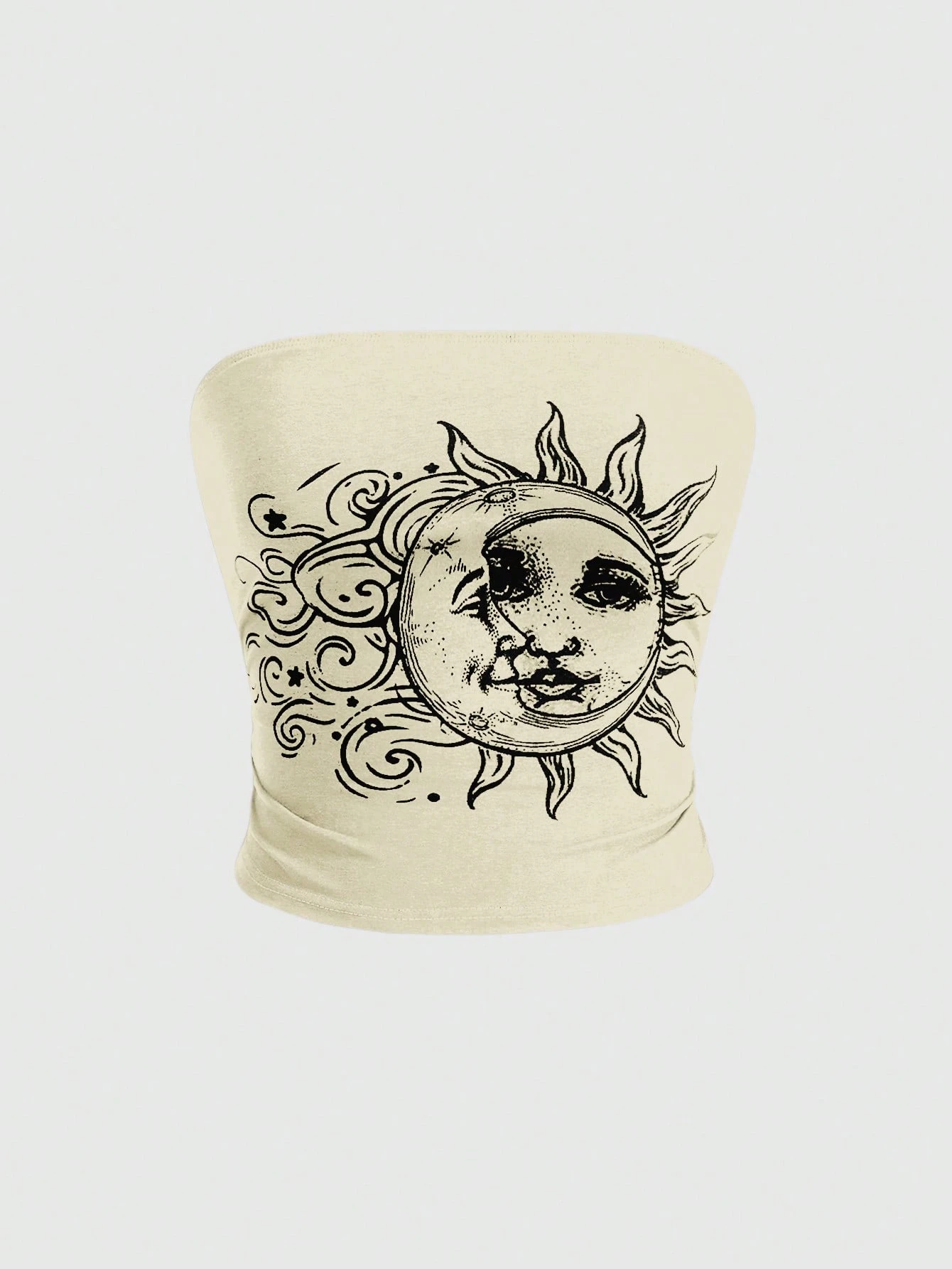 Hippie-Stil Mond & Sonne Muster geraffter Bandeau-Top für Frauen