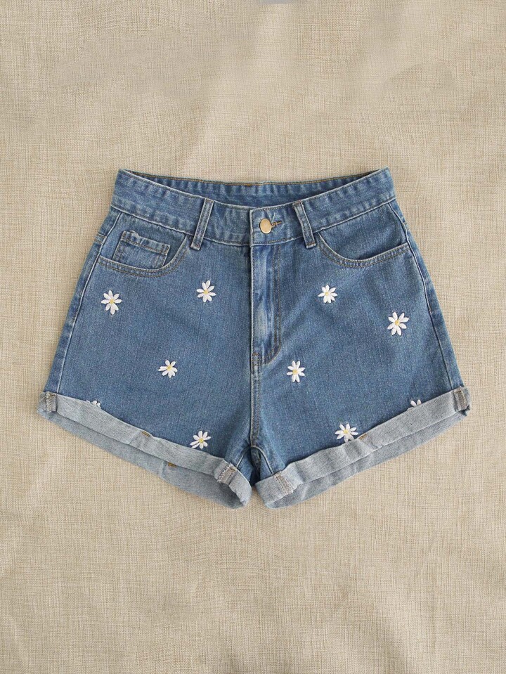 Denim Shorts mit Gänseblümchen Muster und Turn Up Saum