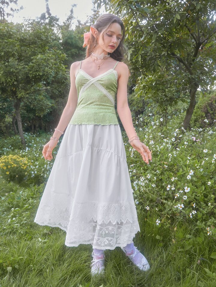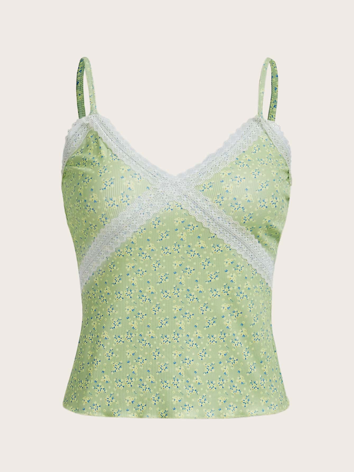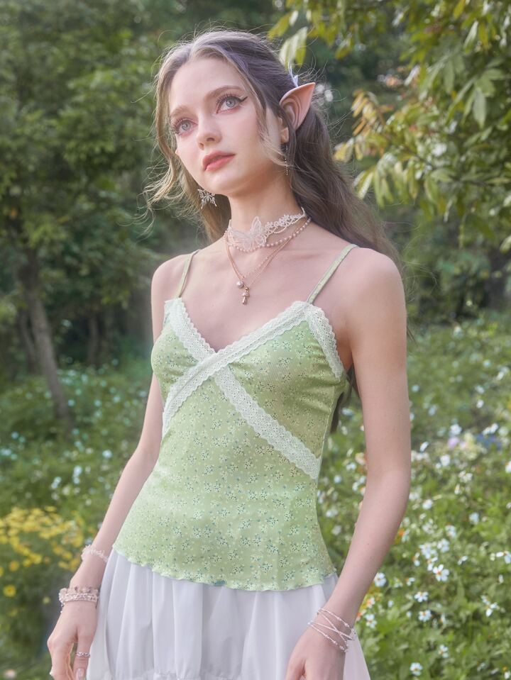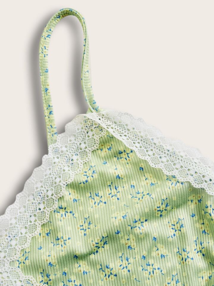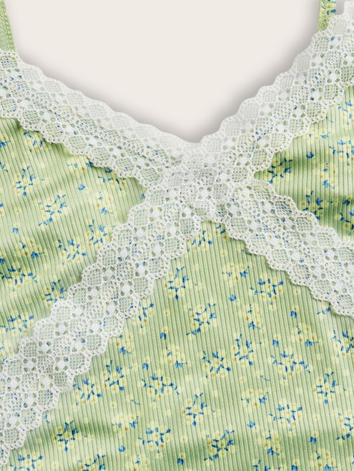 Cami Top mit Blümchen Muster, Kontrast Spitzen