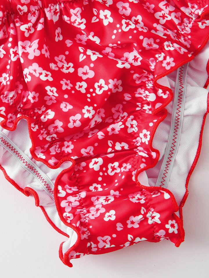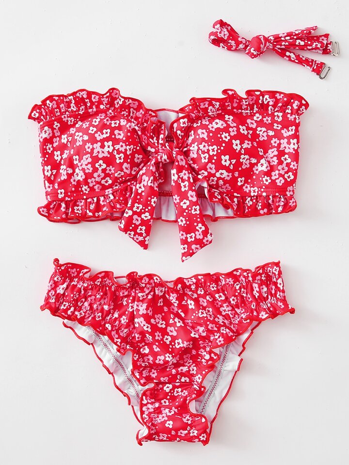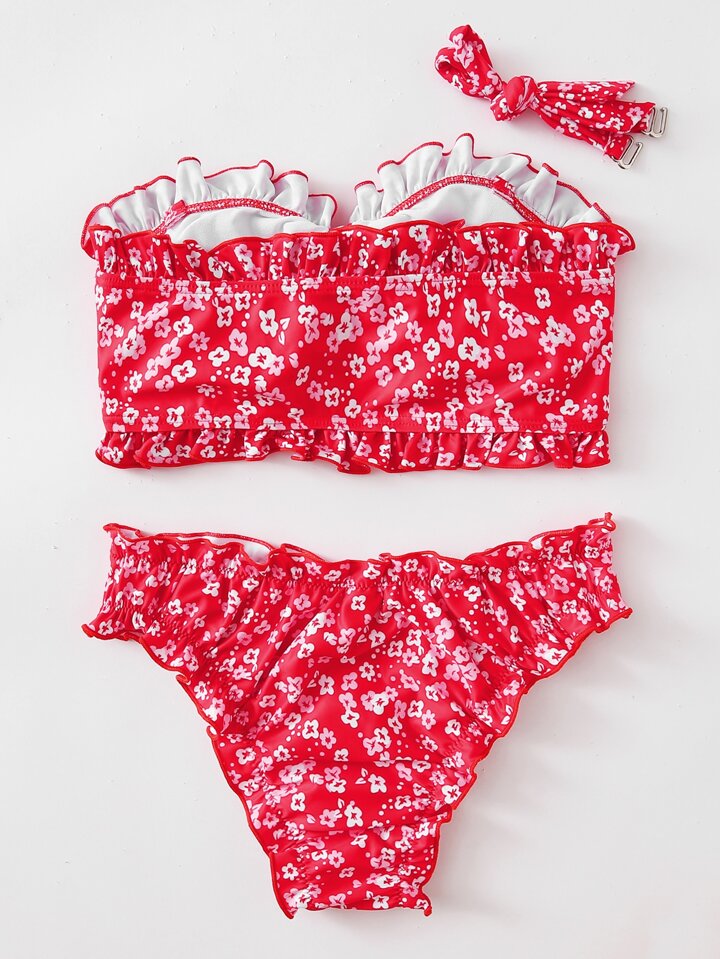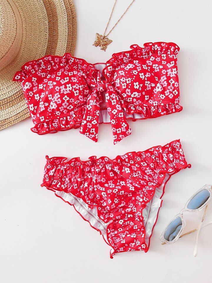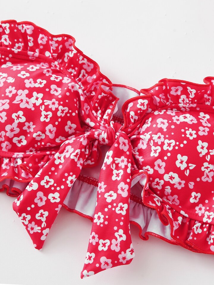 Bandeau Bikini Set mit Ditsy-Blumenmuster und Rüschen, Sommer Strand