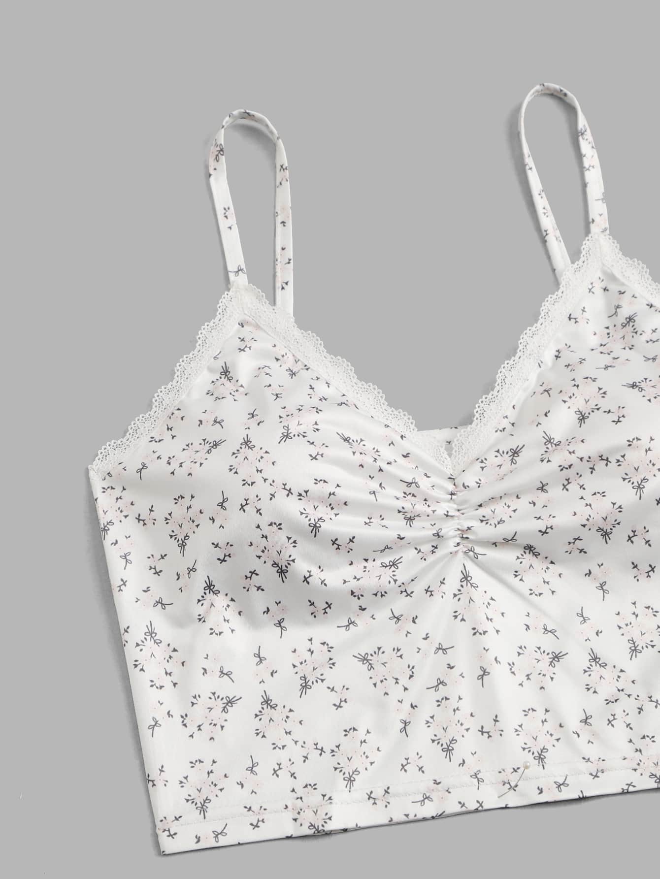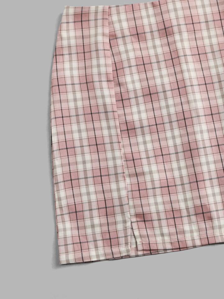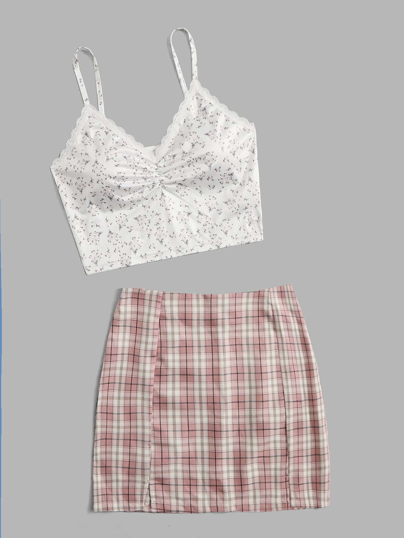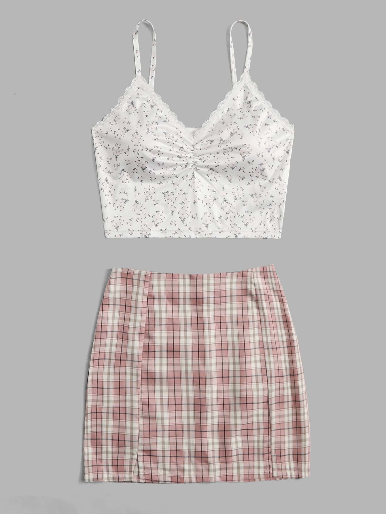Blümchen Muster, Rüschen, Kontrast Spitzen, Crop Cami & Plaid Muster, Schlitz, Rock
