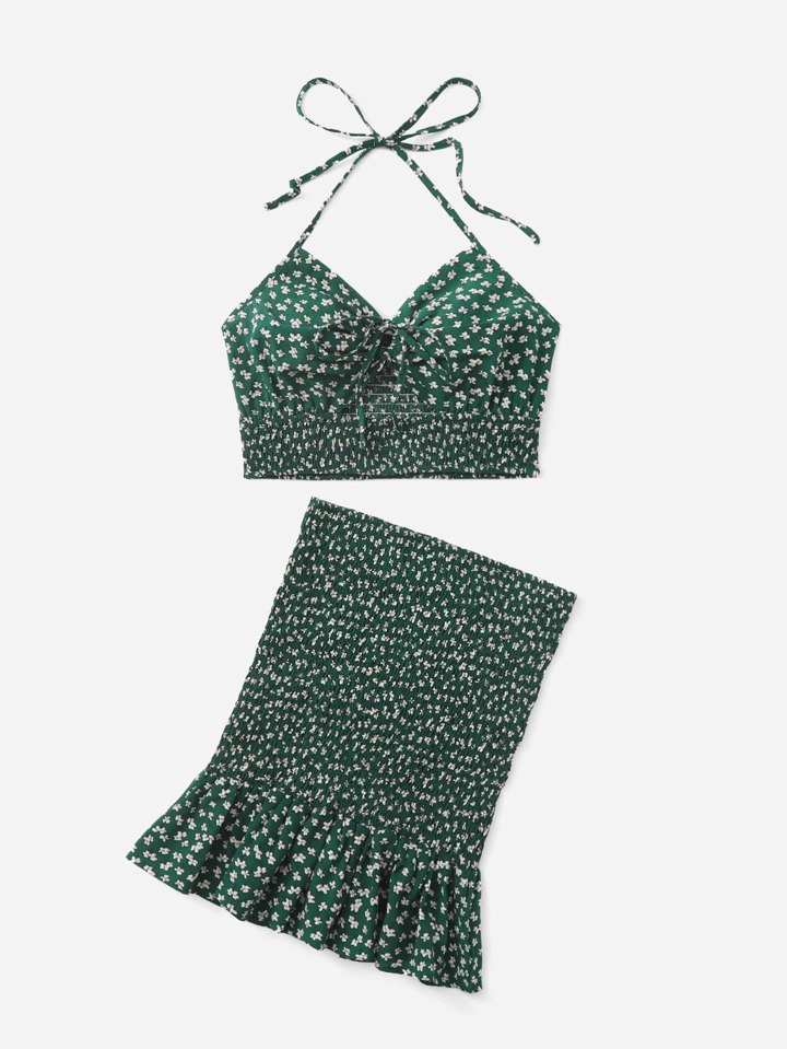 Cami mit Blümchen Muster, Rüschen, Band vorne, & Rock