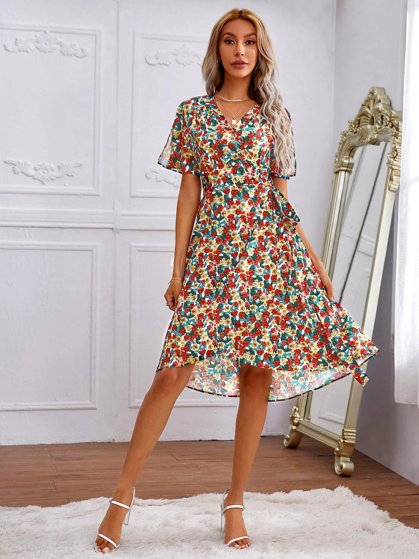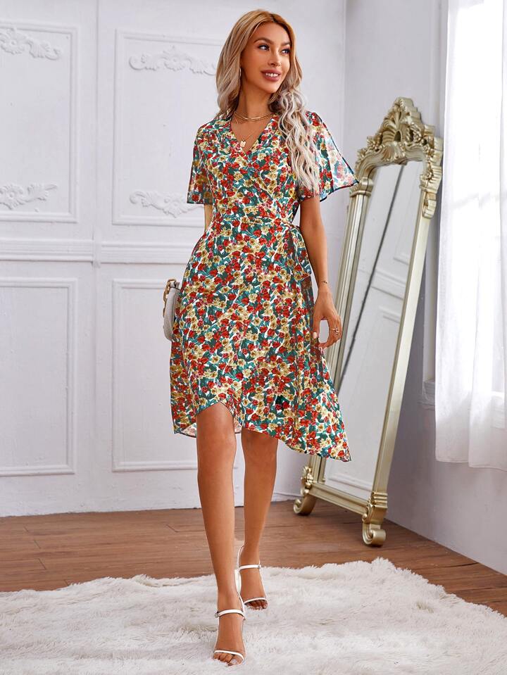 Kleid mit Blümchen Muster, Schlitz auf Ärmeln und seitlichem Band
