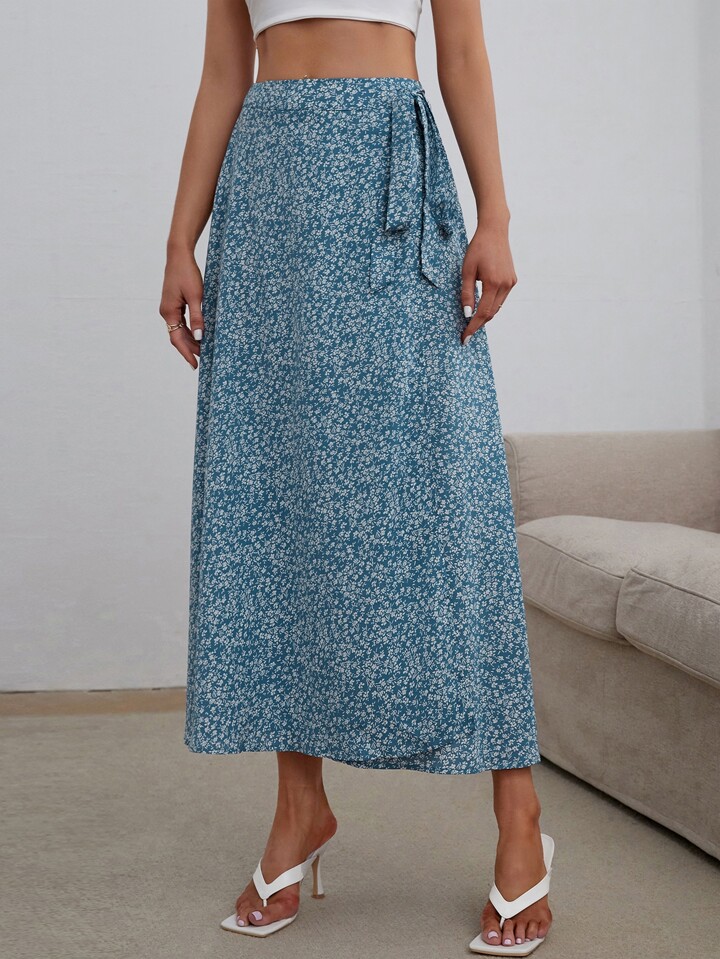 Wickelrock mit Blümchen Muster, Schlitz, seitlichem Knoten