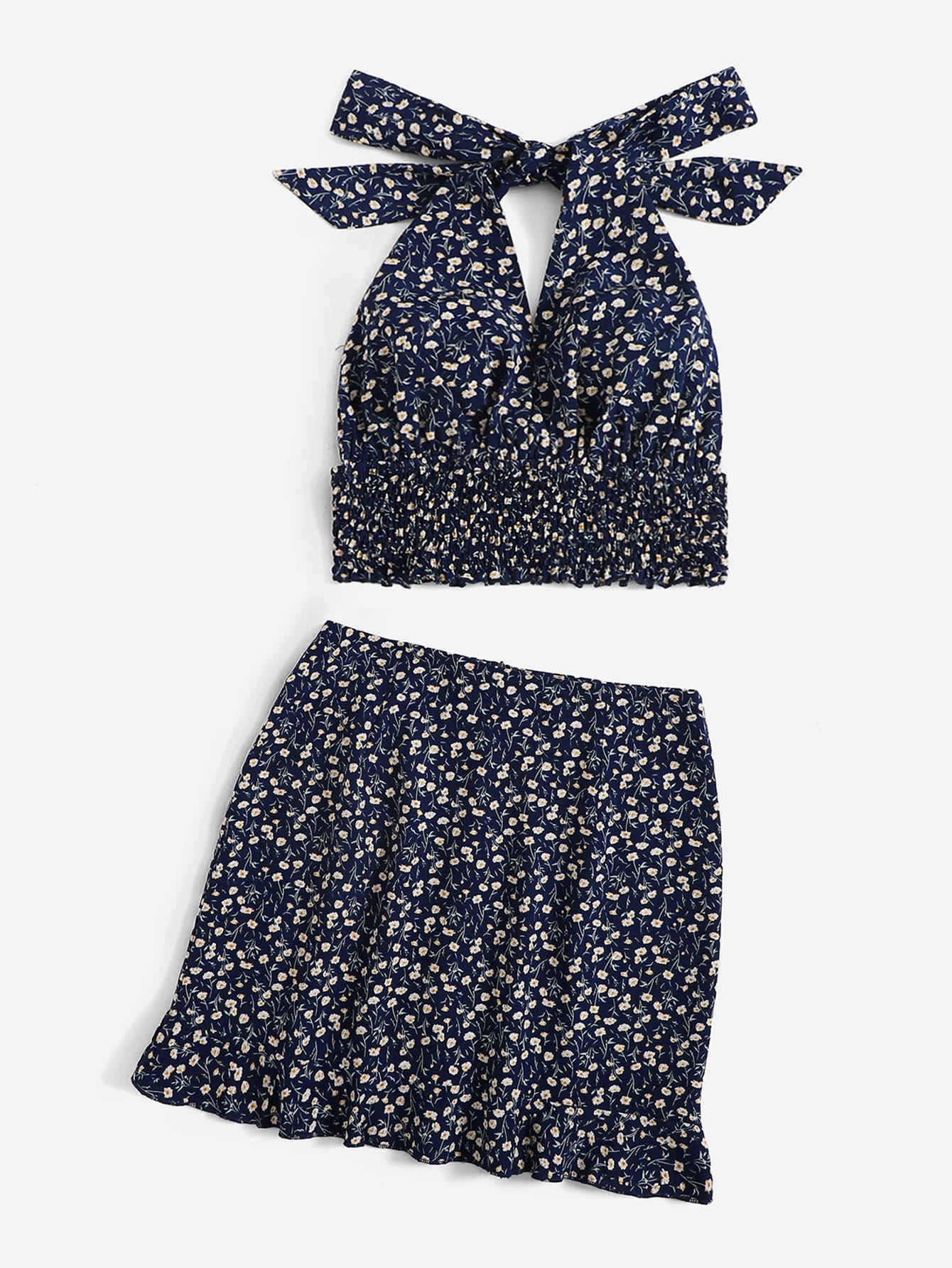 Blümchen Muster, Band hinten, Rüschen, Trägertop & Rock