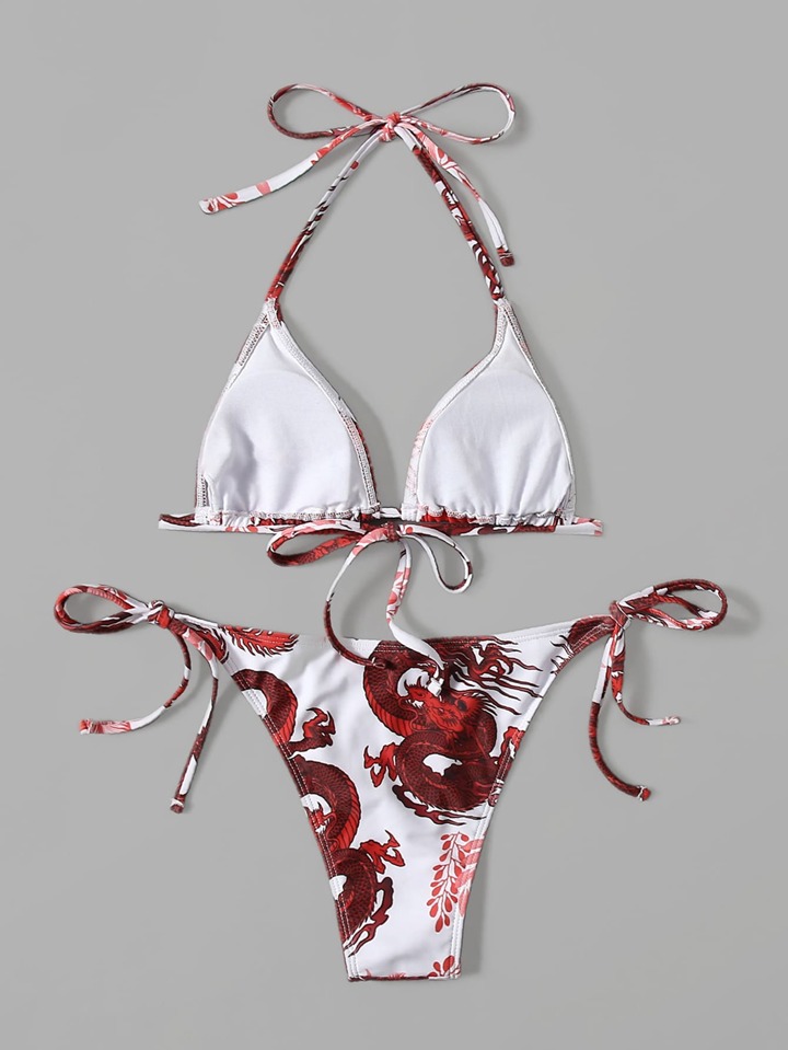Bikini mit Drachenmuster, Neckholder-Bügel-Oberteil und seitlich gebundenen Höschen