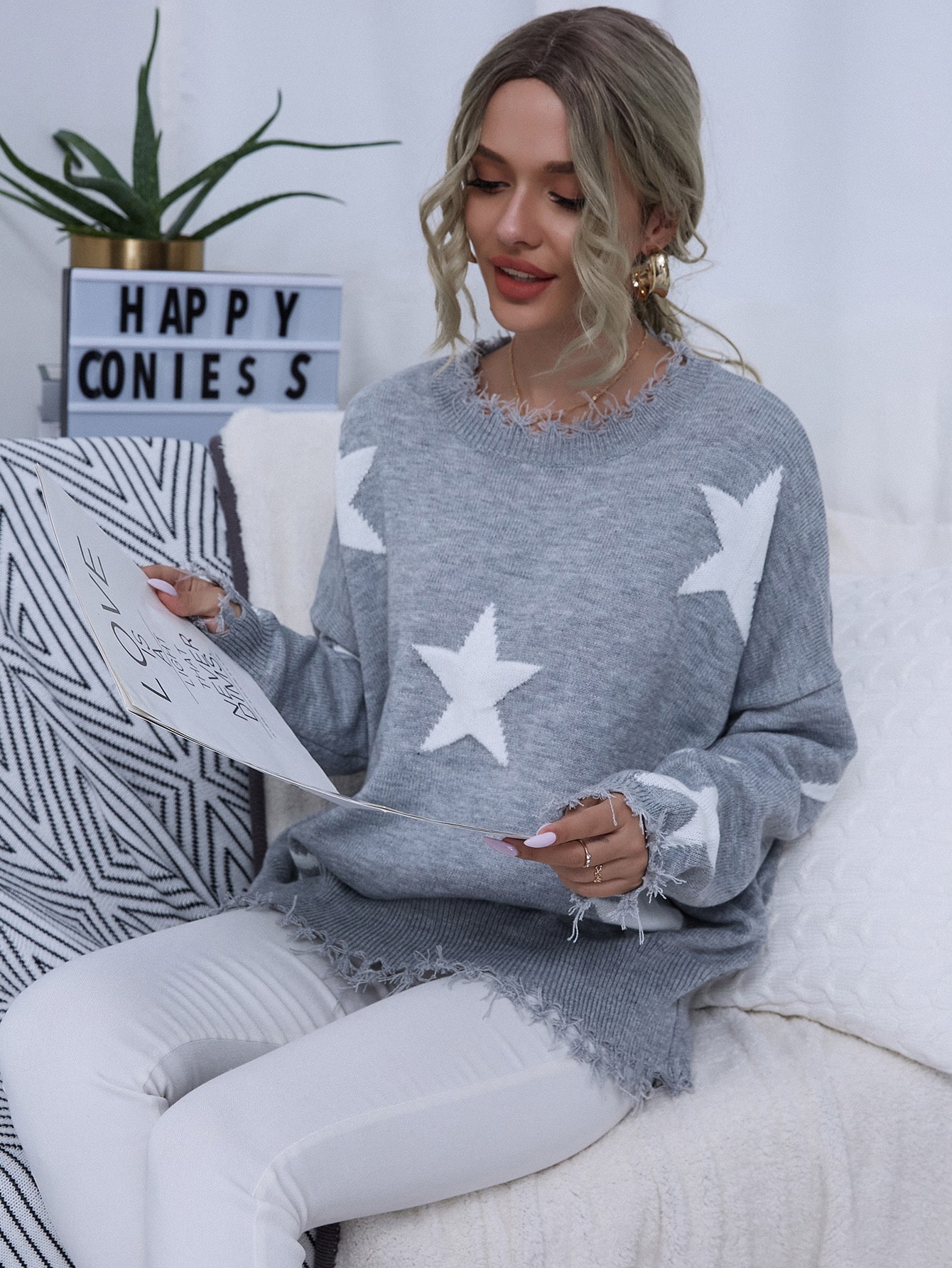 Pullover mit sehr tief angesetzter Schulterpartie, Riss und Stern Muster