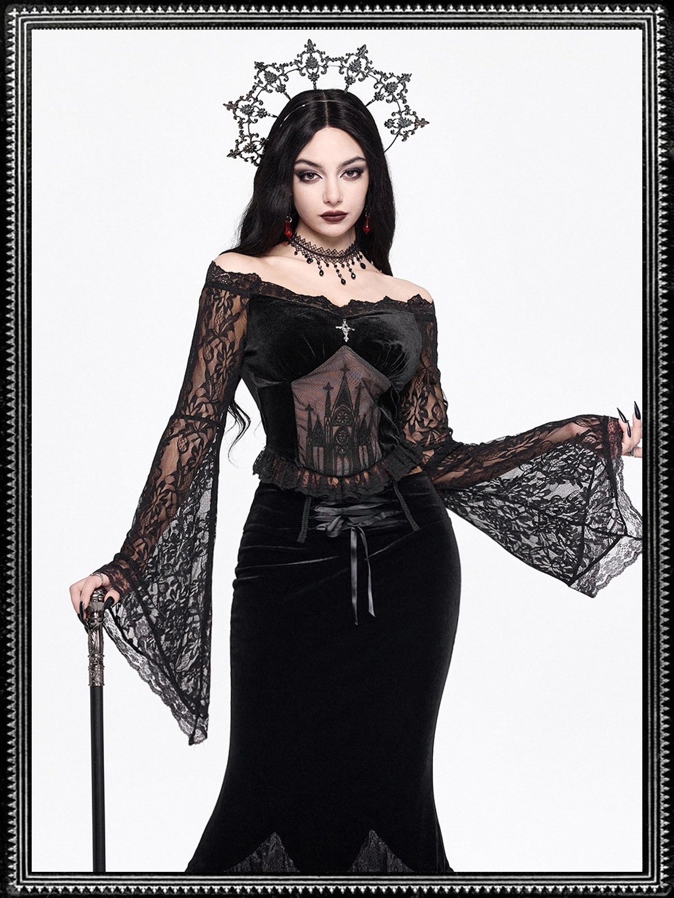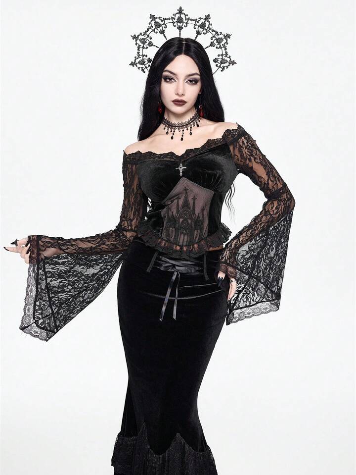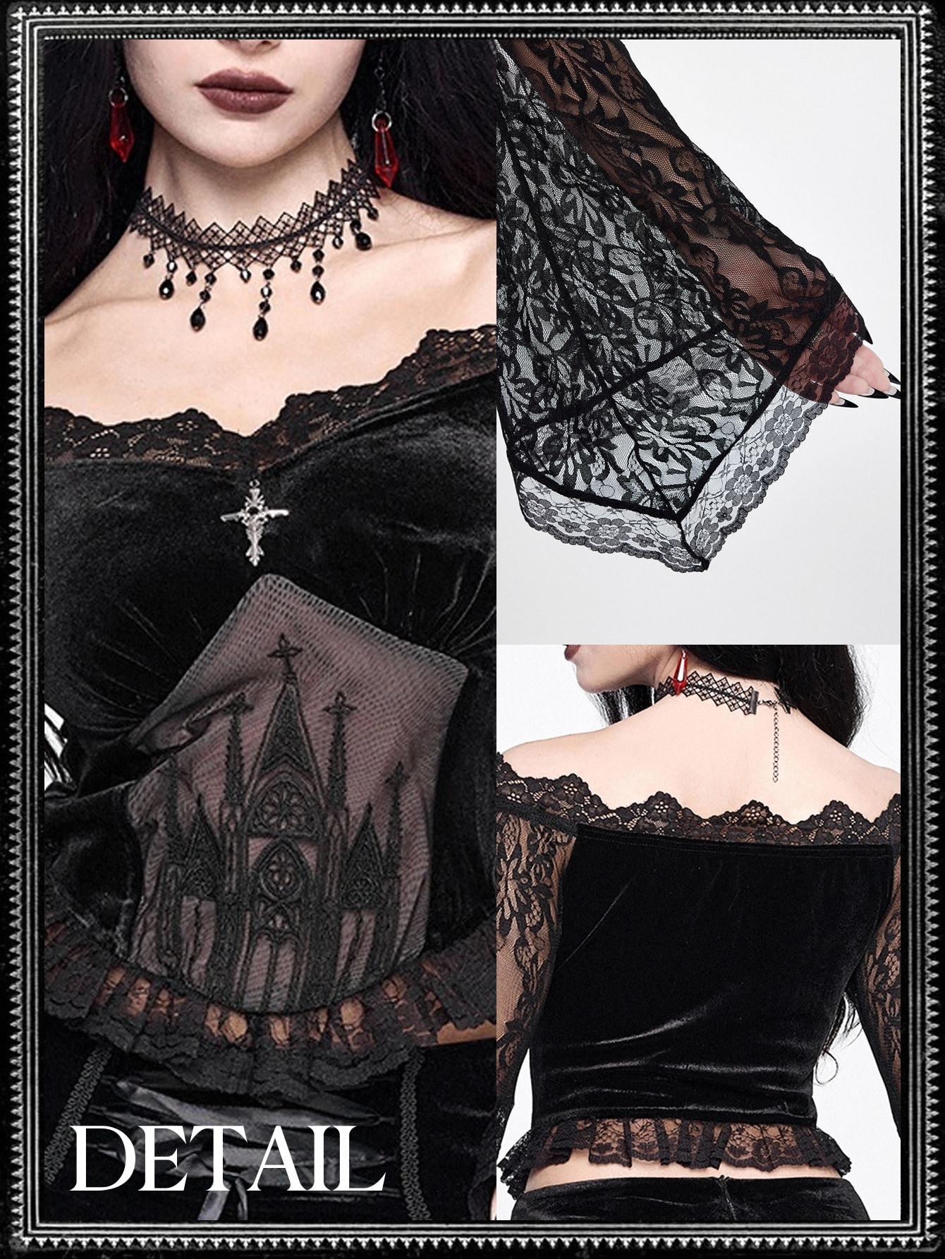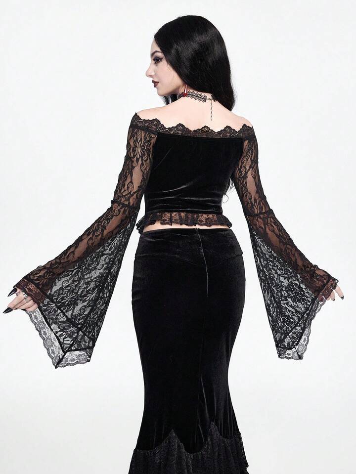 EDITION Gotischer Palast Mesh Schloss Stickerei Kontrast Spitze Off-Shoulder Trompetenärmel Samt Bluse, Halloween