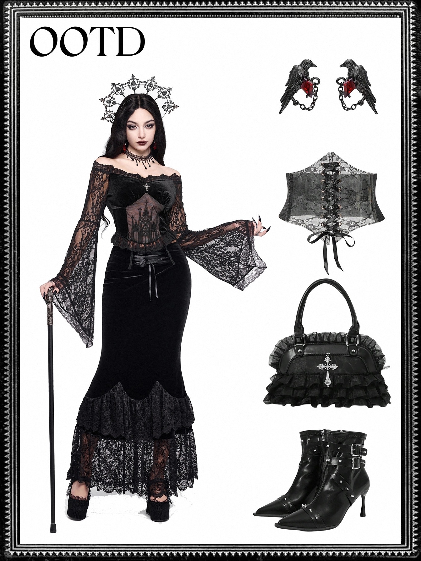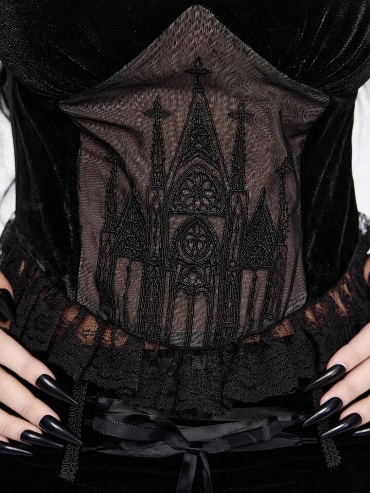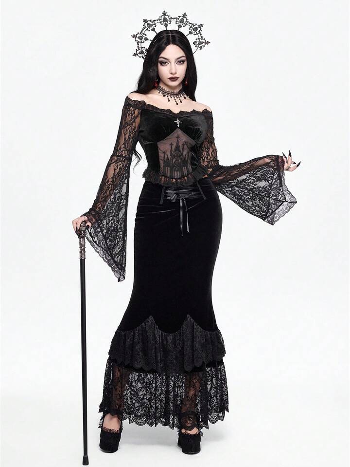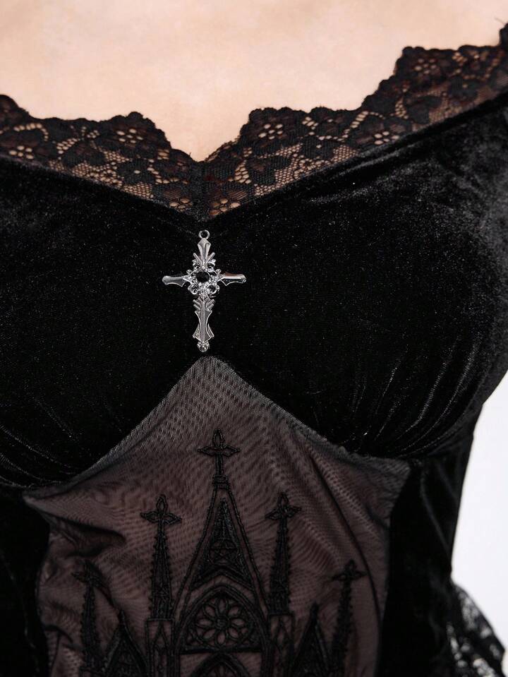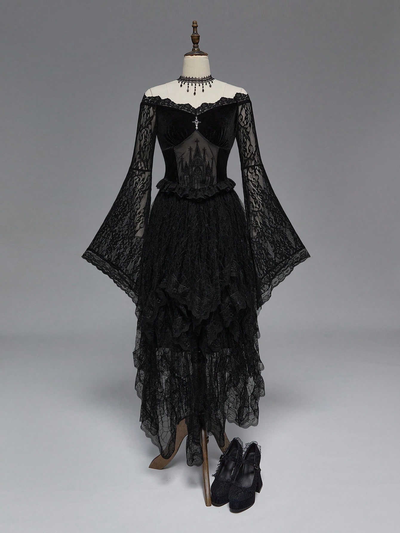 EDITION Gotischer Palast Mesh Schloss Stickerei Kontrast Spitze Off-Shoulder Trompetenärmel Samt Bluse, Halloween